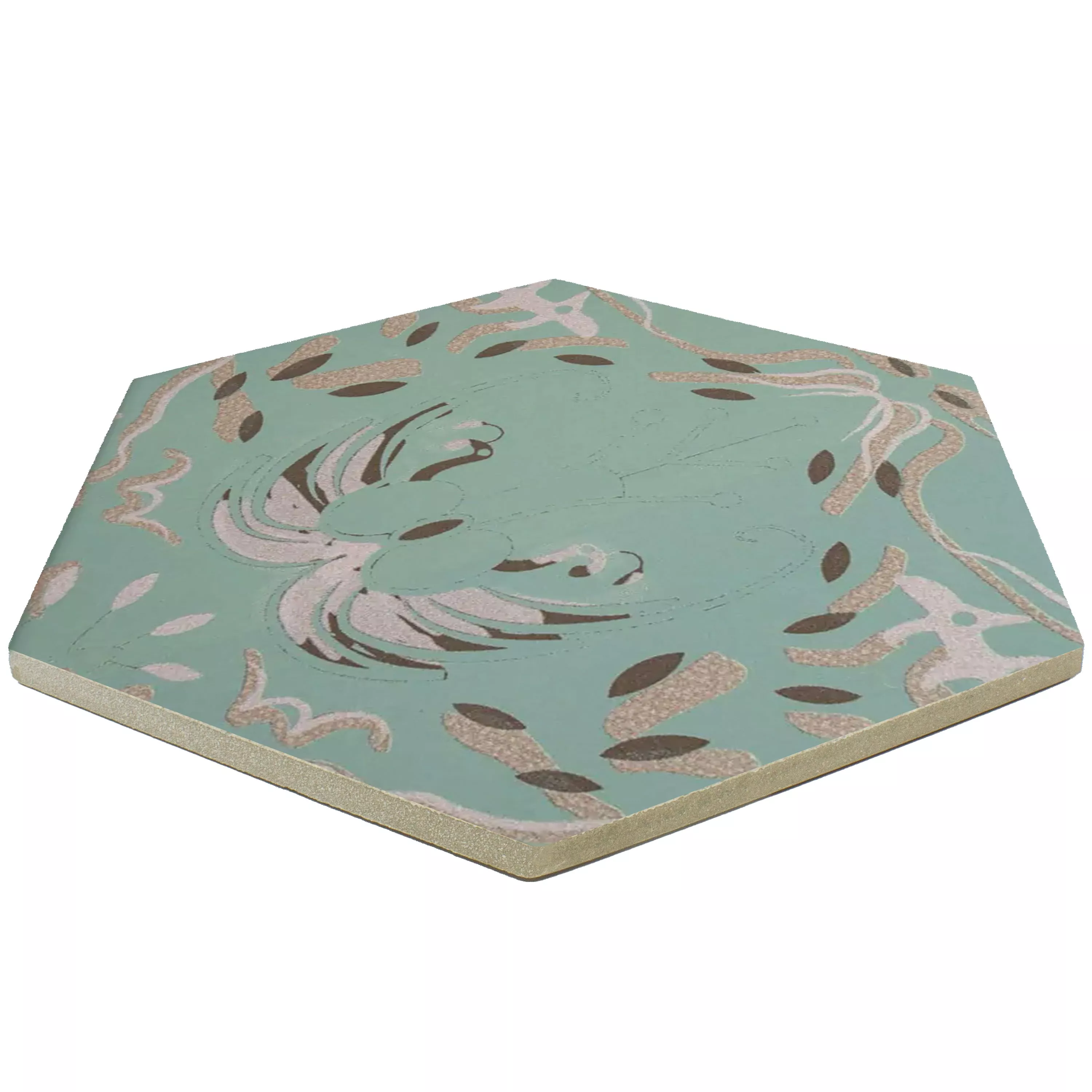 Die Feinsteinzeug Fliesen "Modena Hexagon Decor 5" bieten eine harmonische Fusion aus Funktionalität und ästhetischem Design. Mit einer Stärke von 10mm eignen sie sich ideal für Nassbereiche, Dusche, Bad, Küche, Wohnraum und Innenbereiche. Die matte Oberfläche und das florale Ornament-Motiv in Grün verleihen den Fliesen eine zeitlose Eleganz.