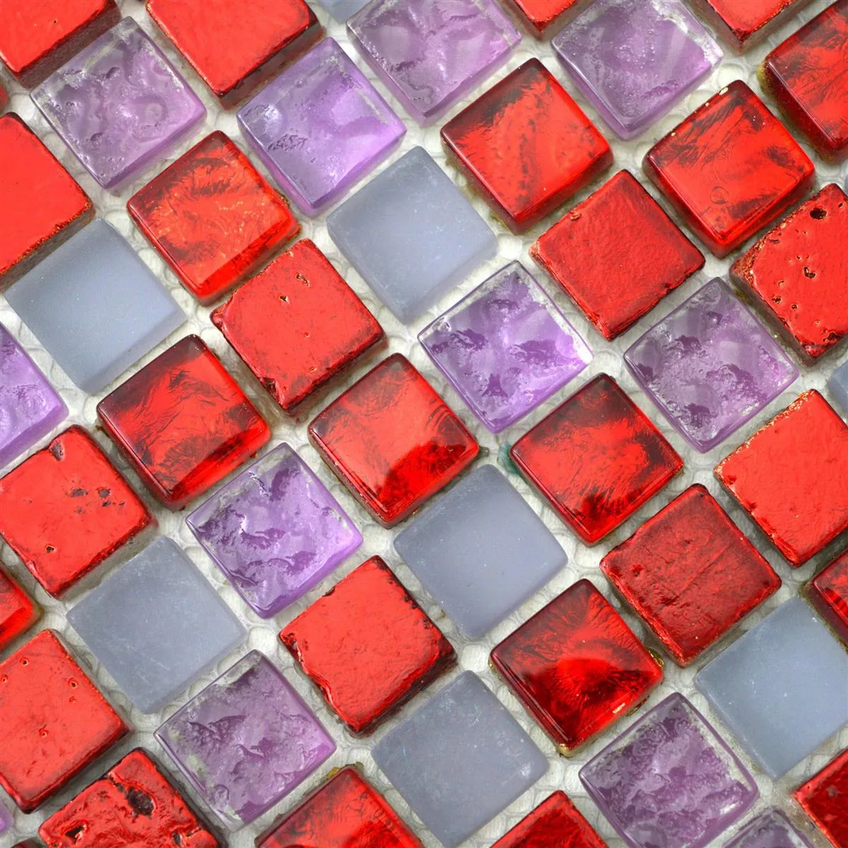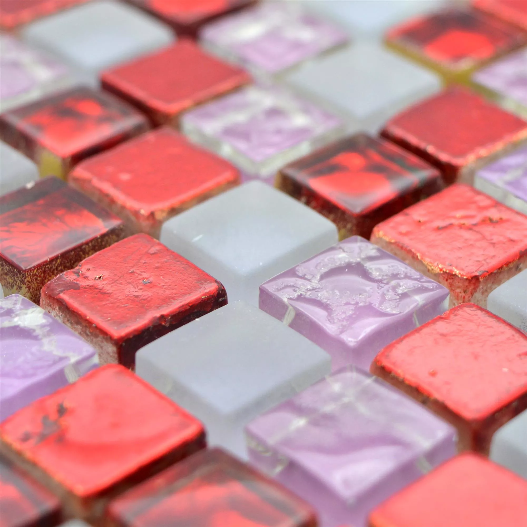 Die Cleopatra Mosaikfliesen in den lebhaften Farben Rot, Pink und Weiß vereinen Naturstein und Glas zu einem faszinierenden Design, das sowohl matt als auch glänzend ist. Diese Fliesen sind speziell für Wände geeignet und bieten eine auffällige, elegante Optik.