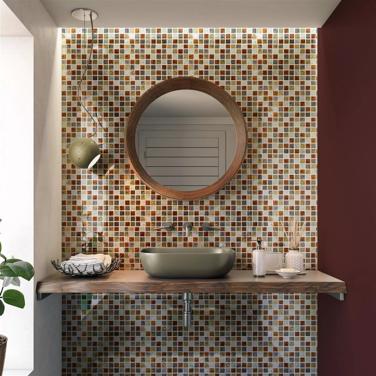 Die Crystal Glasmosaik Fliesen Bonnie Struktur in den Farben Rot, Gold und Silber sind eine stilvolle Wahl für jeden Raum. Sie können als Akzent- oder dekorative Fliesen in verschiedenen Bereichen verwendet werden, um eine edle und luxuriöse Atmosphäre zu schaffen.