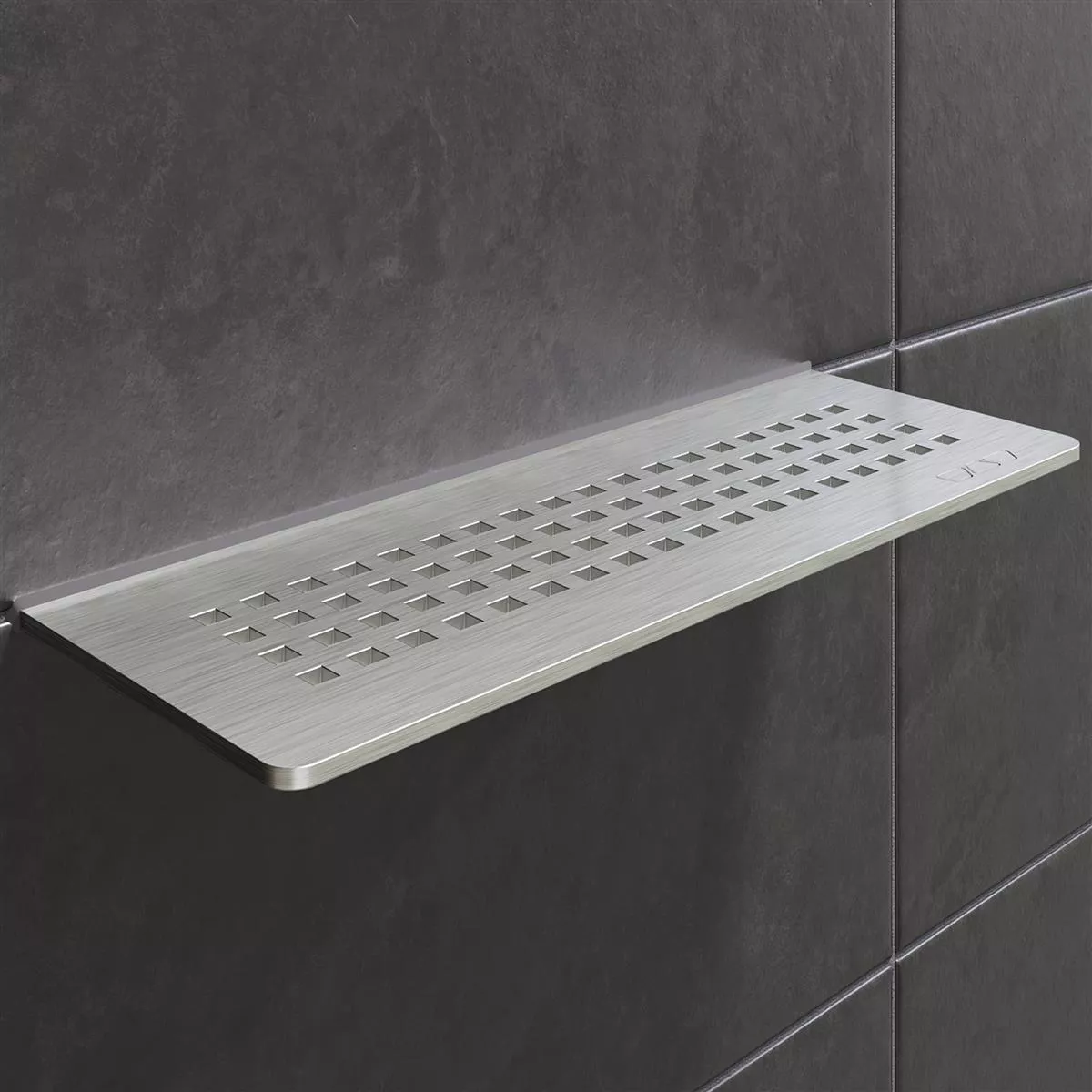 Rektangulär vägghylla Oavsett om det är i badrummet eller köket: Du kan använda den rektangulära hyllan Schlüter-SHELF-W var som helst på den plana väggen där du för närvarande lägger dina plattor. Tack vare trapetsformade perforerade fästben är hyllorna extremt stabila och spänstiga, men imponerar samtidigt också med sitt moderna utseende. Du kan inte bara välja mellan fem attraktiva design, utan också mellan borstat rostfritt stål och aluminium, varav den sistnämnda är högkvalitativ pulverlackerad med en populär TRENDLINE-färg eller en MyDesign RAL-färg.