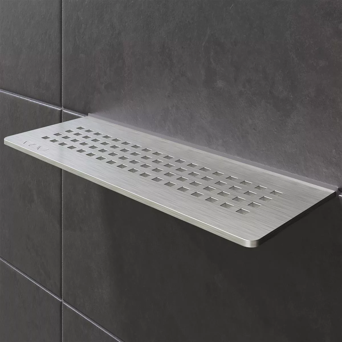 Rektangulär vägghylla Oavsett om det är i badrummet eller köket: Du kan använda den rektangulära hyllan Schlüter-SHELF-W var som helst på den plana väggen där du för närvarande lägger dina plattor. Tack vare de trapetsformade perforerade fästbenen är hyllorna extremt stabila och spänstiga, men de imponerar samtidigt med sitt moderna utseende. Du kan inte bara välja mellan fem attraktiva design, utan också mellan borstat rostfritt stål och aluminium, varav den sistnämnda är högkvalitativ pulverlackerad med en populär TRENDLINE-färg eller en MyDesign RAL-färg.