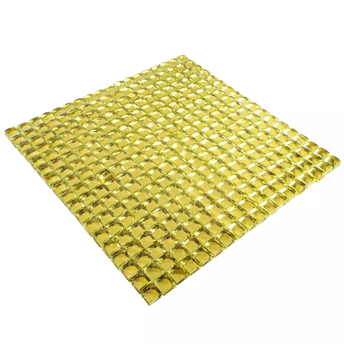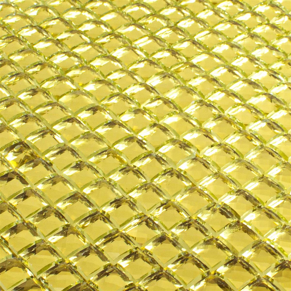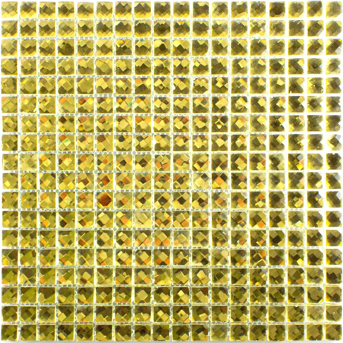 Kakelplattorna är i en lyxig guldton och gjorda av högkvalitativt glas. Den blanka ytan och det slående 3D-utseendet ger varje rum ett speciellt djup och ljusreflektion. Varje platta har en stenstorlek på 15 x 15 mm och en tjocklek på 8 mm. Kakelmattan mäter 30 x 30 cm och täcker en yta på 0,090 m².