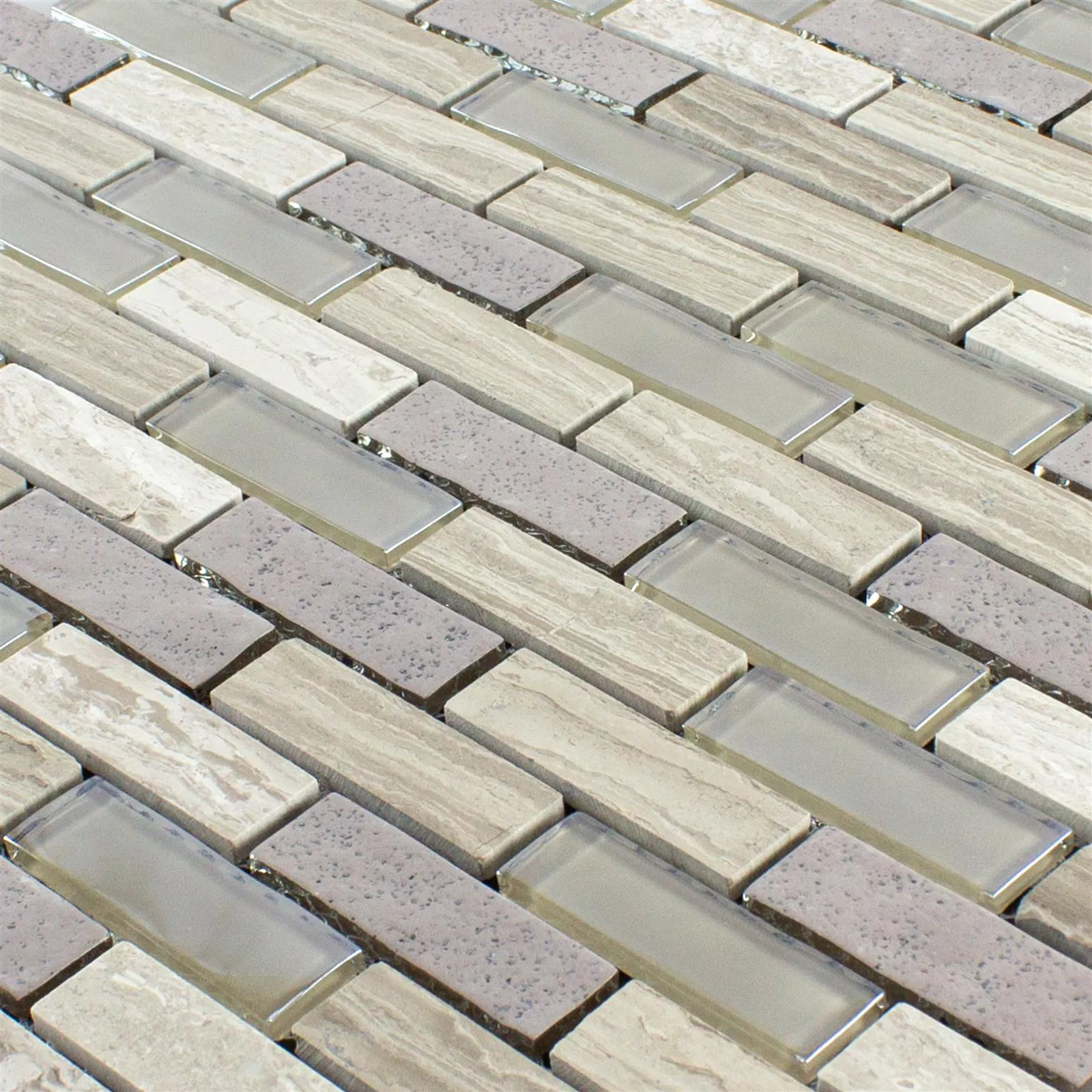 Dessa rektangulära mosaikplattor med en storlek på 29,8x30,4cm och en tjocklek på 5mm är idealiska som väggplattor för badrum, kök och vardagsrum. Den självhäftande designen gör installationen enklare, men det bör noteras att de inte är lämpliga för användning i våtutrymmen som duschar eller badkar. Plattorna är gjorda av en kombination av natursten och glas och finns i grått. Stenstorleken är 15x48mm och ytan kan vara antingen matt eller blank.