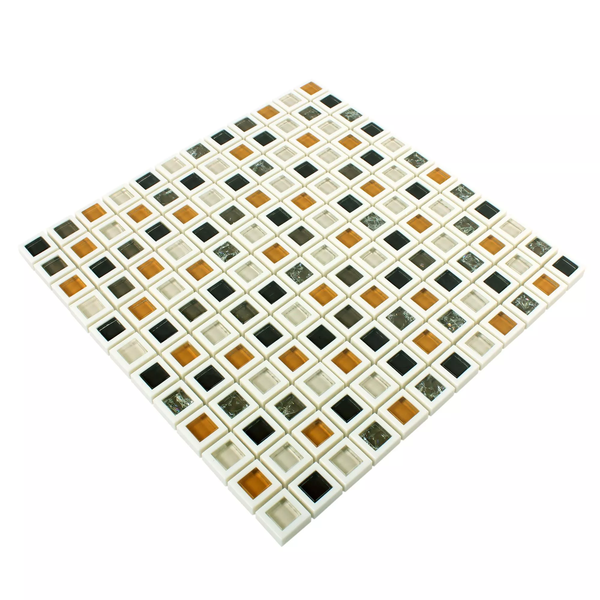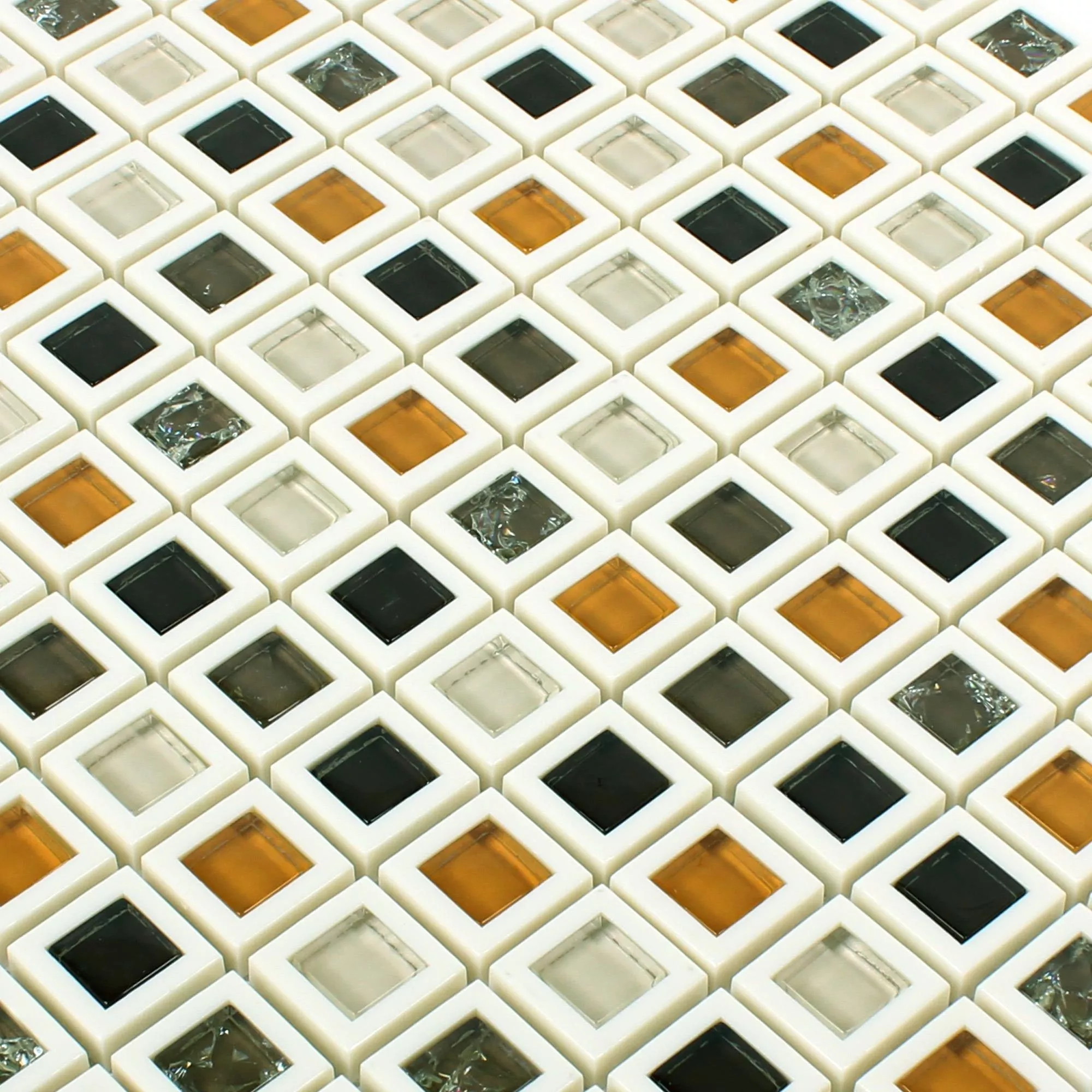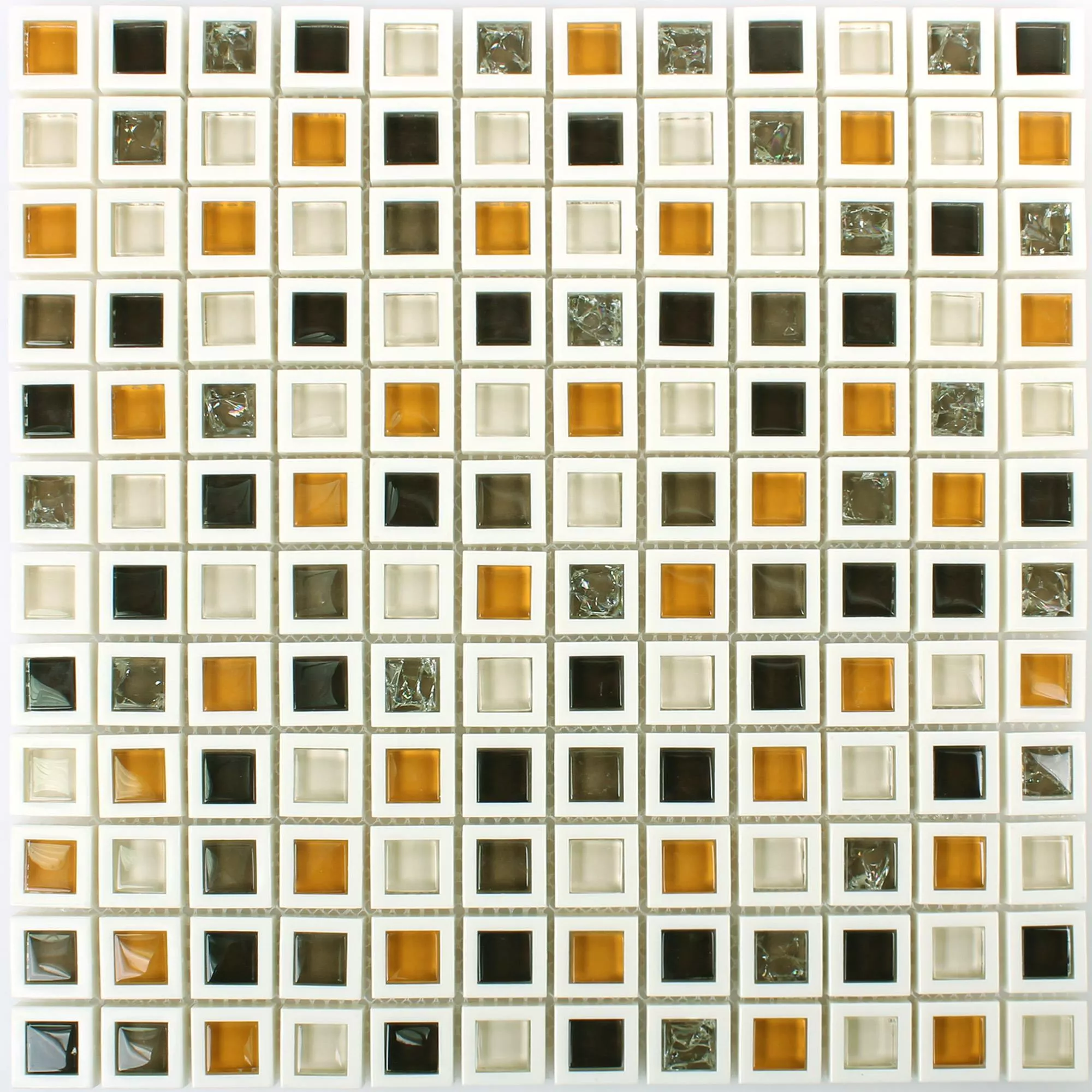 Mosaikplattorna i det grön-vita paketet kombinerar ljust vitt med accenter i olika gröna nyanser, varav en del tenderar mot blåaktigt. I den andra ljusa varianten ställer vitt, mörkt och gulbrunt glas in färghöjdpunkter. De enskilda väggplattorna kantas av var och en av en vit ram.
