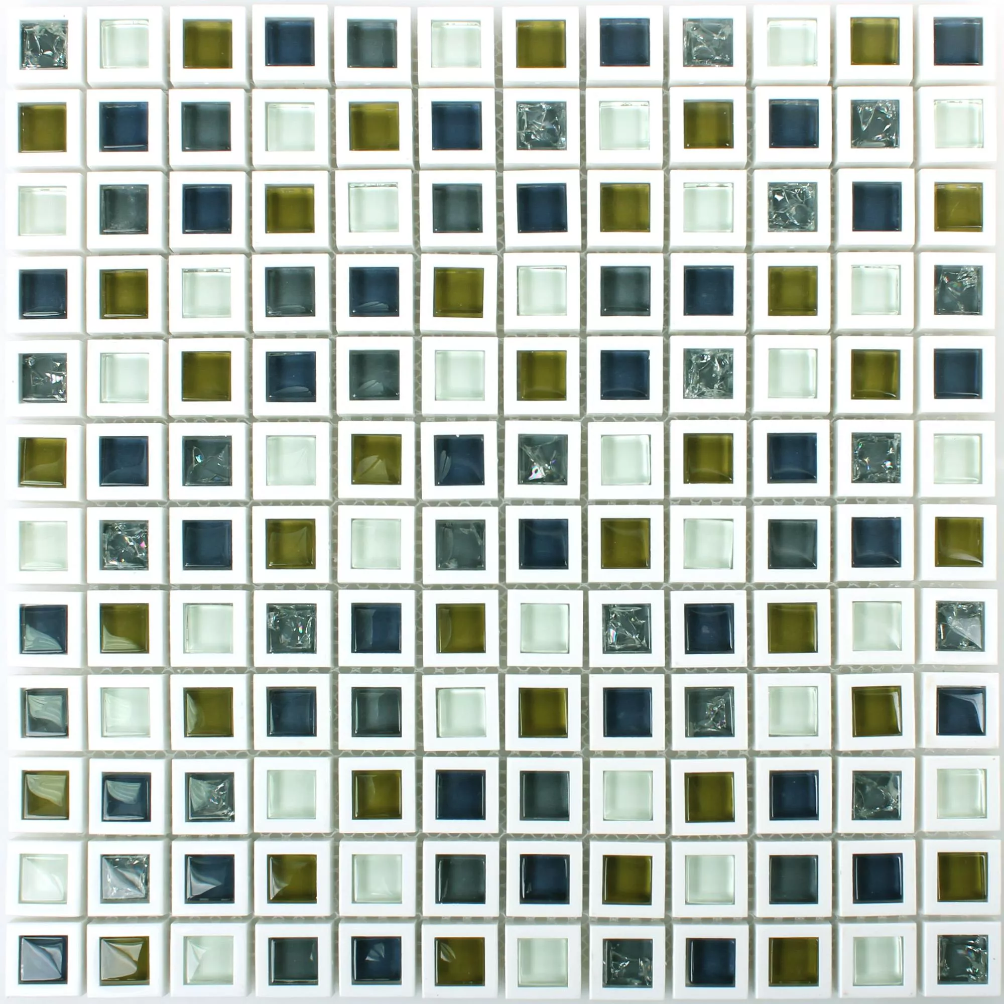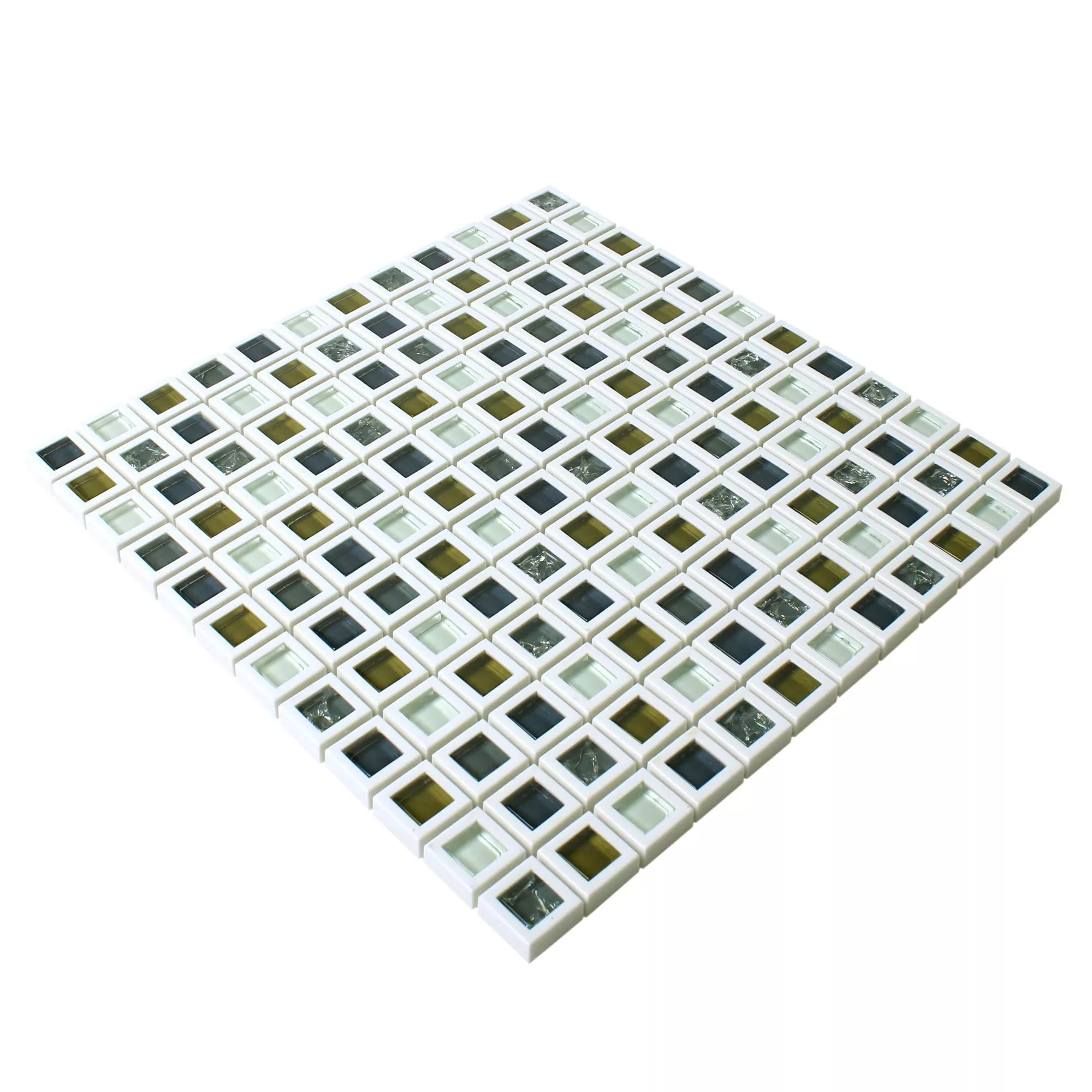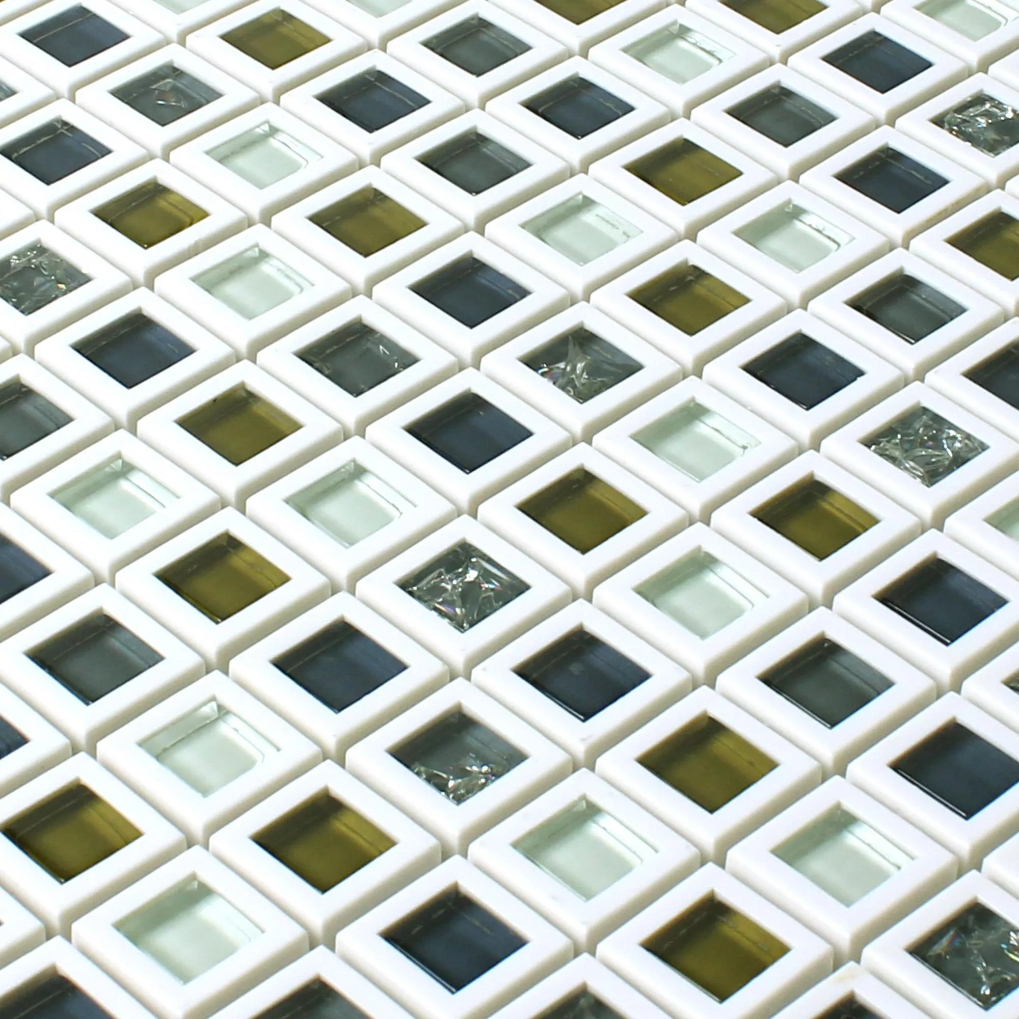 Mosaikplattorna i det grön-vita paketet kombinerar ljust vitt med accenter i olika gröna nyanser, varav en del tenderar mot blåaktigt. I den andra ljusa varianten ställer vitt, mörkt och gulbrunt glas in färghöjdpunkter. De enskilda väggplattorna kantas av var och en av en vit ram.