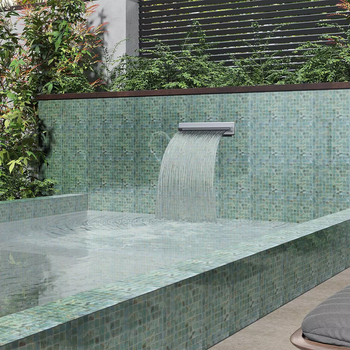 Alassio poolmosaik i turkos ger en livlig, fräsch look till din design. Med en matta som mäter 31,6 x 31,6 cm och en tjocklek på 4 mm är denna platta perfekt för väggar och golv. Kakelplattan är gjord av högkvalitativt ekoglas och kännetecknas av en glänsande naturstenslook som ger moderna rum en elegant touch.