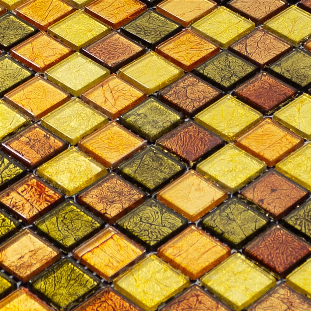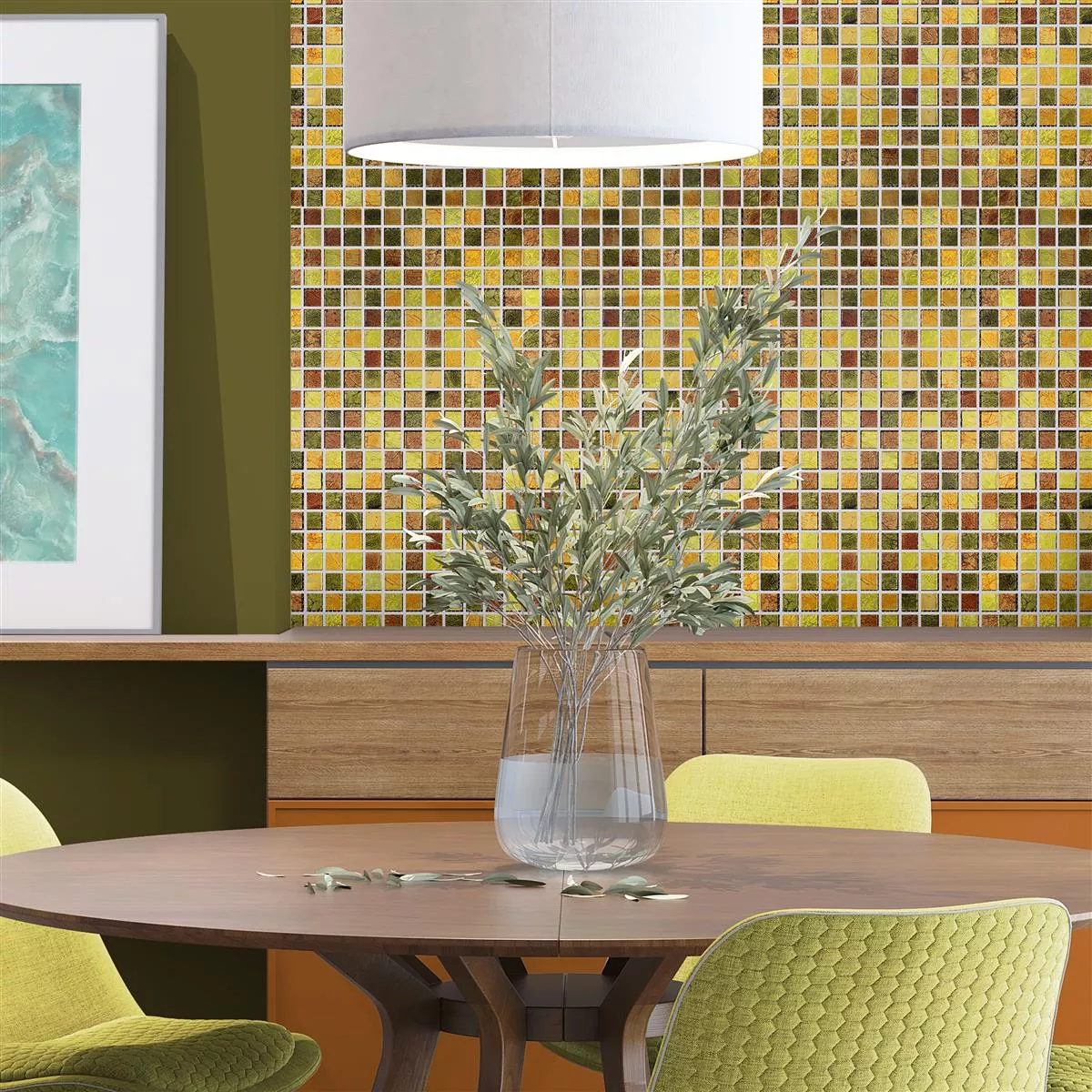 Upptäck den pulserande variationen med våra glasmosaikplattor Curlew Yellow Orange Red. Dessa fyrkantiga golv- och väggplattor med en stenstorlek på 23x23mm ger din inredning en spännande textillook i färgerna gul, orange och röd. Den blanka ytan och en fogbredd på 2 mm framhäver den livliga optiken.