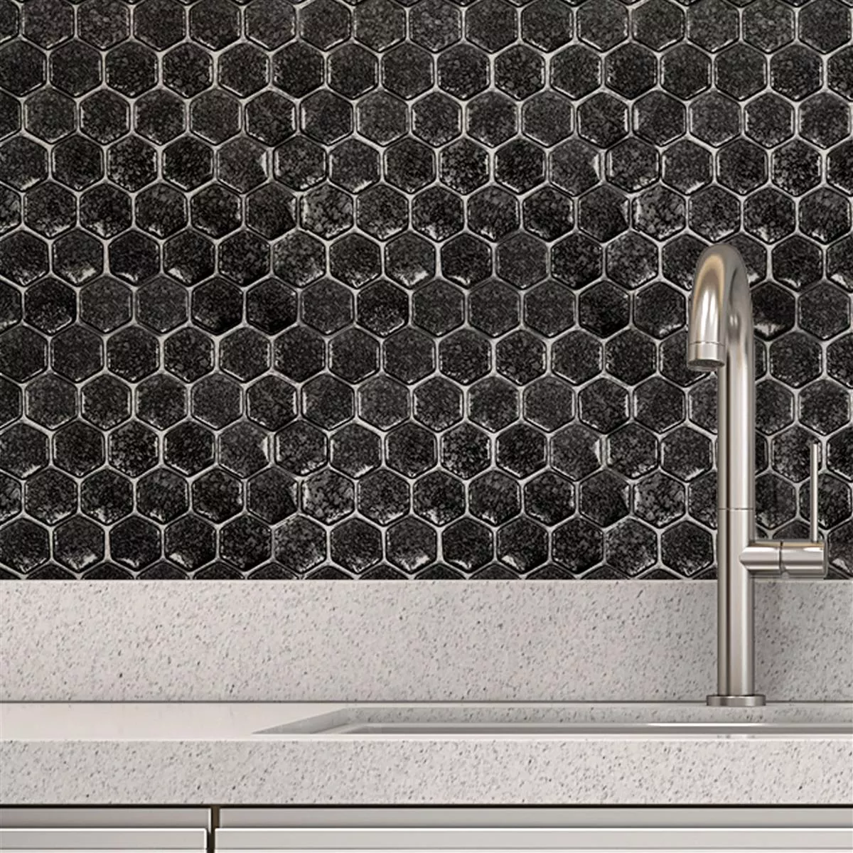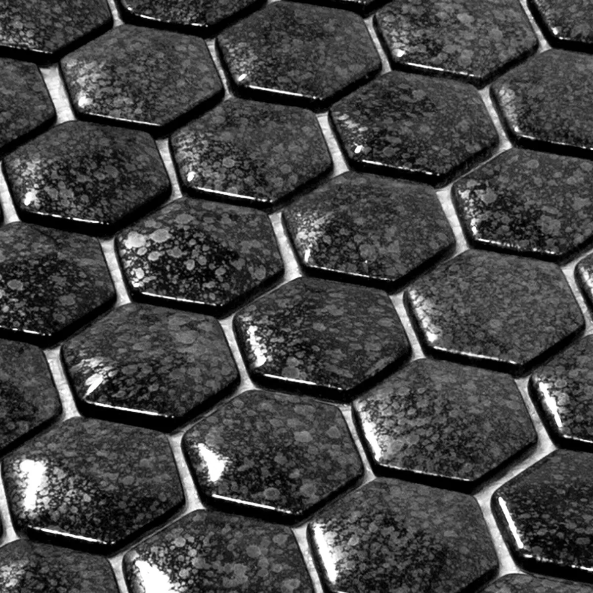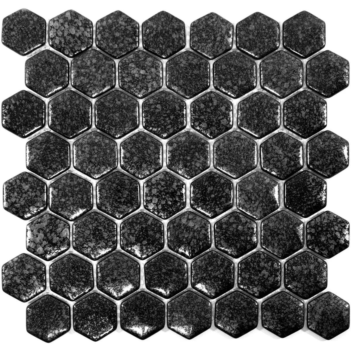 Mosaikplattorna finns i ett praktiskt hexagonformat på 29 x 29 cm. Varje platta mäter 40 x 40 mm och är 7,5 mm tjock, vilket skapar en slående men harmonisk look. Den blanka ytan fångar ljuset och förstärker den eleganta gråtonen, som kan integreras i olika inredningsdesigner på en mängd olika sätt.