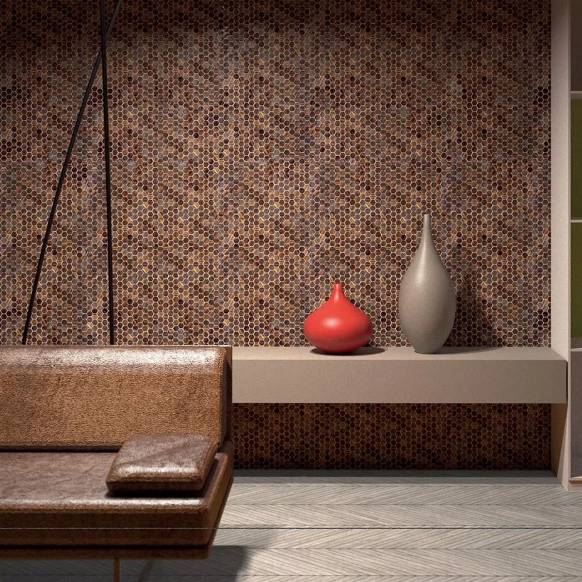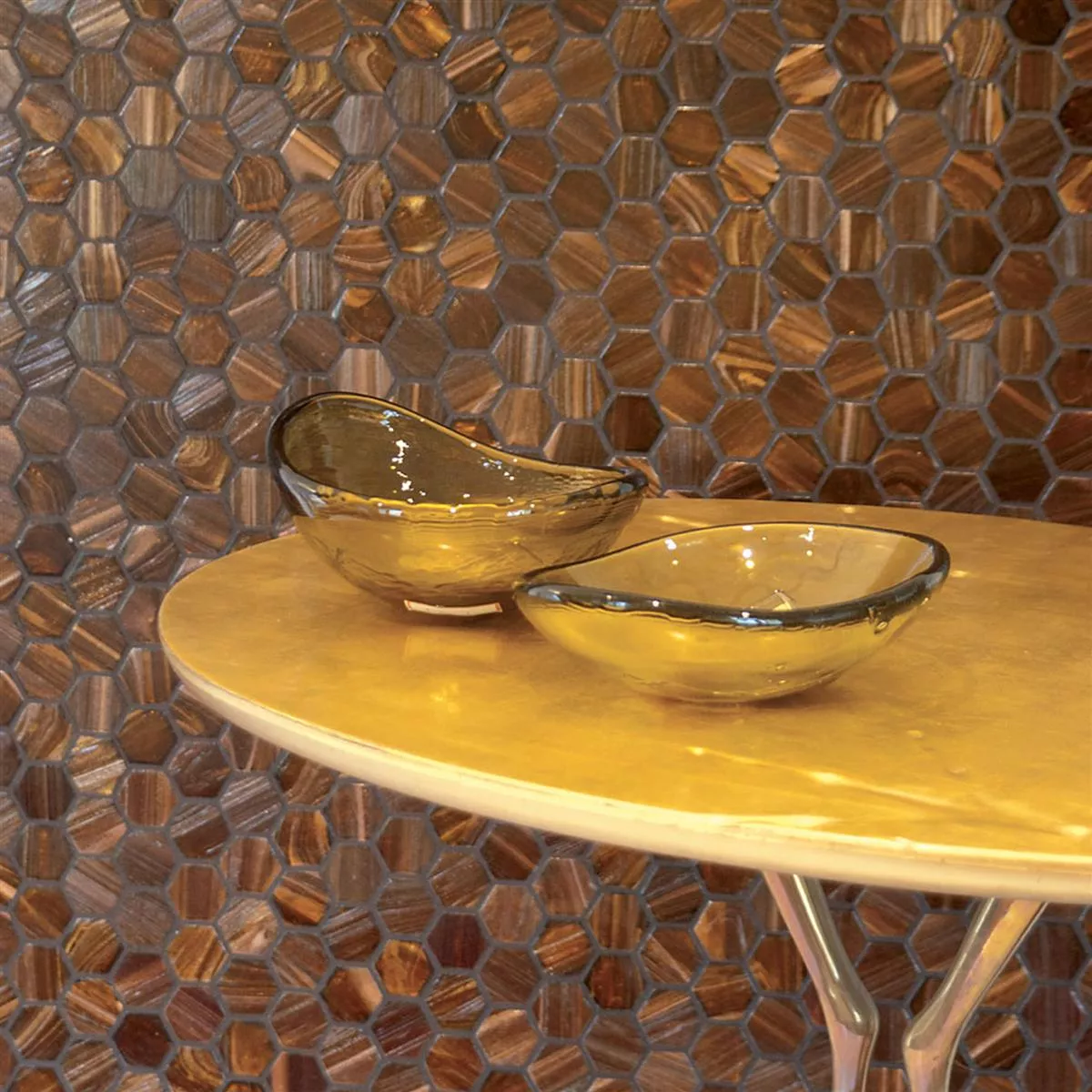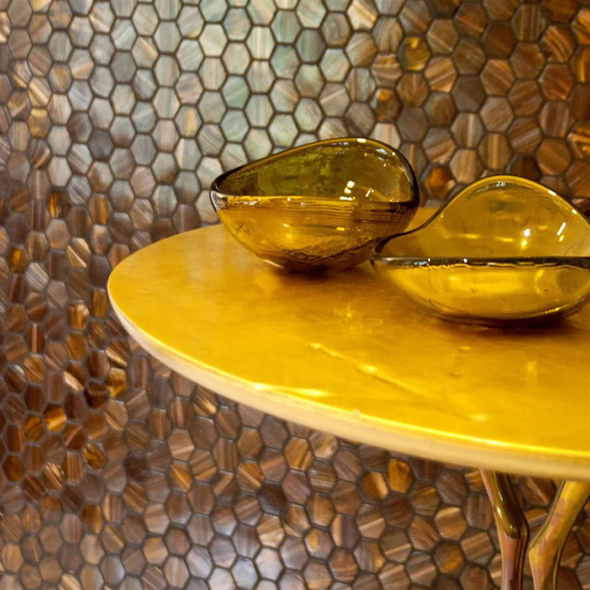 Fördjupa dina rum i en unik atmosfär med vår glasmosaik från Hexagonal-serien. Denna mångsidiga glasmosaikplatta är lämplig för en mängd olika tillämpningar. Den är idealisk för inomhusbruk, till exempel badrum, kök eller uterum. Den är även lämplig för utomhusbruk, till exempel garage eller poolområden.
