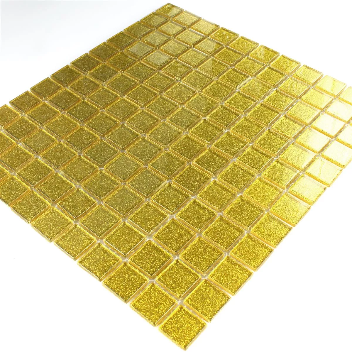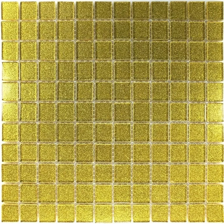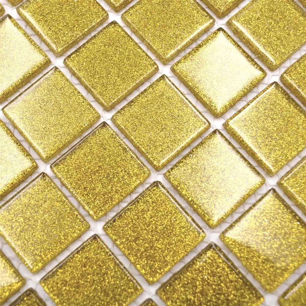 Glasmosaikplattan Wichita i guldglitter vecklar ut sin dekorativa effekt inte bara i kök och badrum. Den dekorativa, glittrande ytan ger också sov- och vardagsrumsutrymmen en speciell atmosfär. När det gäller hygien, hållbarhet och enkel skötsel är väggplattor överlägsna all annan beklädnad. Glasmosaikplattor med glitteryta är en trend inom vardagsrumsdesign. Med dem kan både subtil design med en lätt strukturerad yta och starka kontraster med iögonfallande färger skapas.
