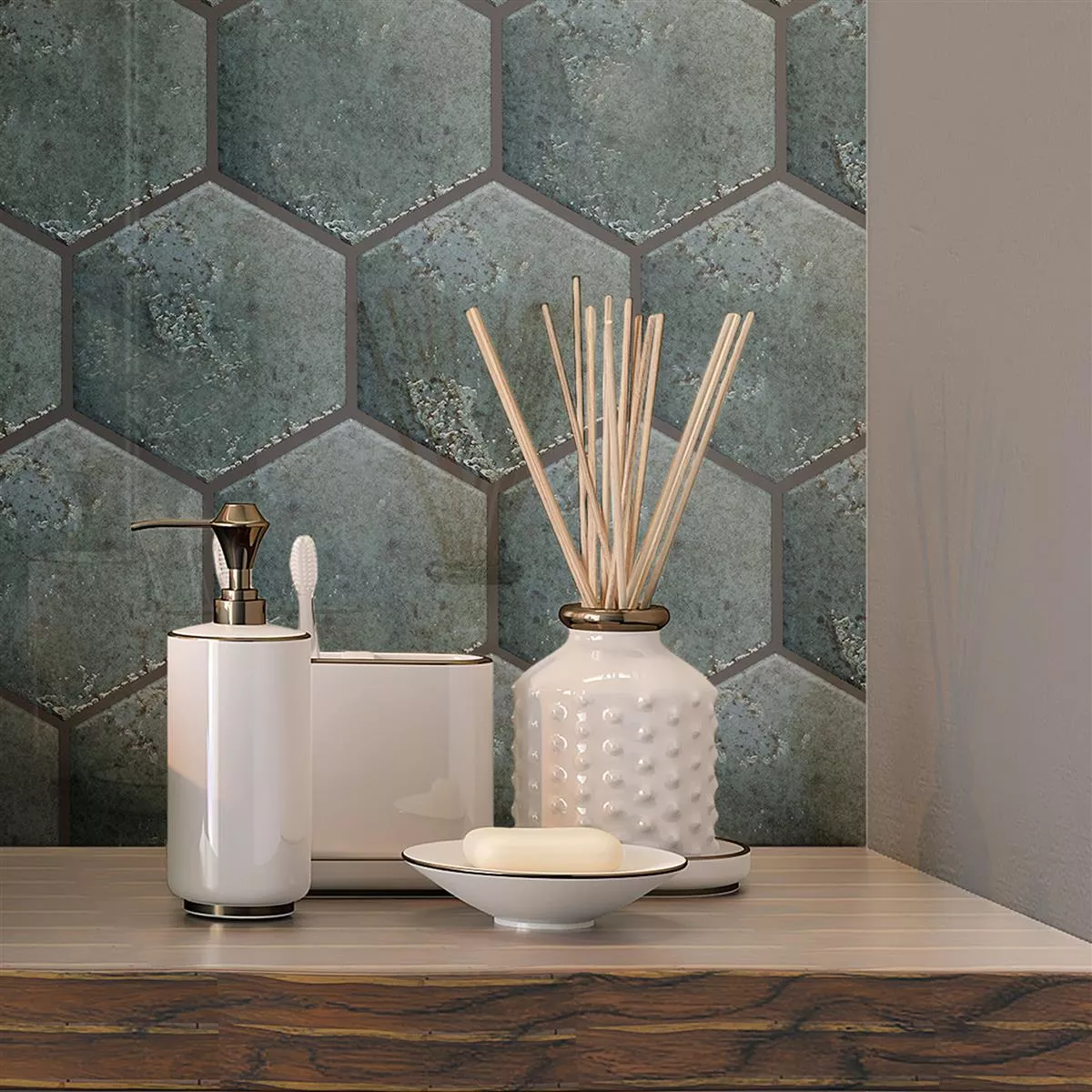 Med en tjocklek på 7 mm är plattan robust och idealisk för en rad applikationer inklusive badrum, duschar, kök och vardagsrum. Det hexagonala formatet (13 x 15 cm) tillför en modern geometrisk estetik till dina rum och kan kombineras flexibelt.