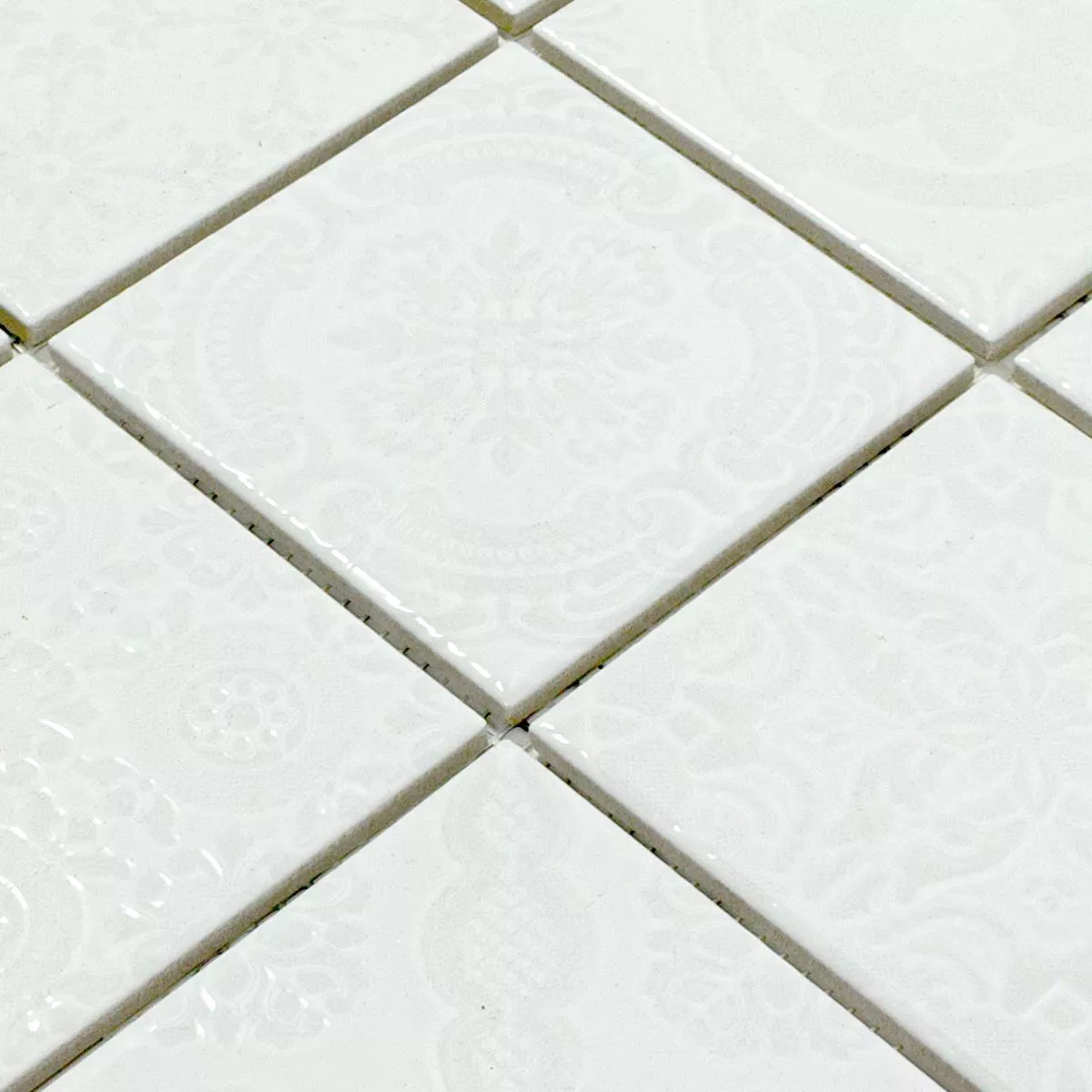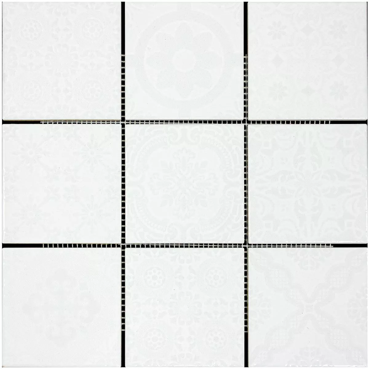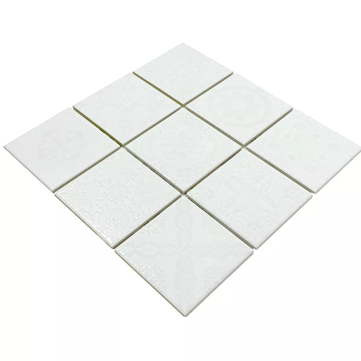 Upptäck en framgångsrik kombination av retrochic och tidlös elegans med våra keramiska mosaikplattor Rivabella Relief White. Dessa fyrkantiga golv- och väggplattor med en stenstorlek på 97x97mm ger ditt vardagsrum, kök och badrum en unik karaktär. Den blanka ytan och reliefdesignen skapar en speciell retrolook.