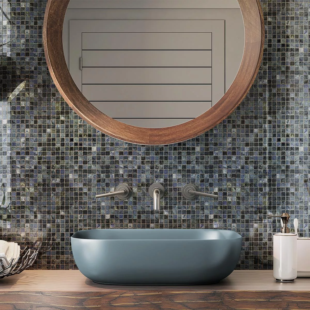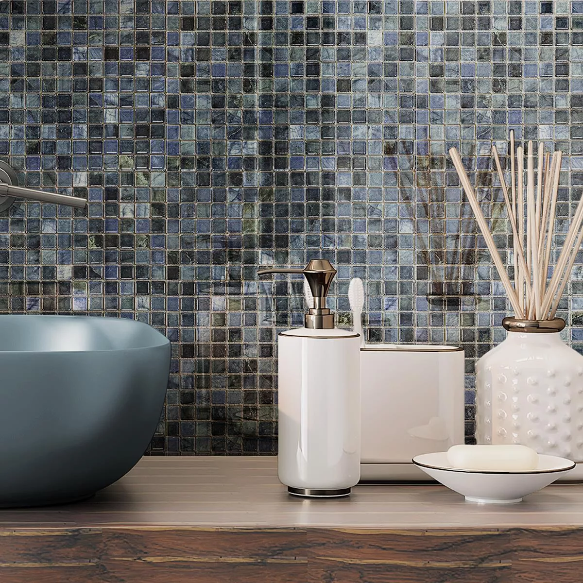Elysium keramiska mosaikplattor i elegant blått ger en touch av fräschör och modernitet till dina rum. Deras glänsande yta i marmorlook ger väggar och golv ett elegant och modernt utseende.