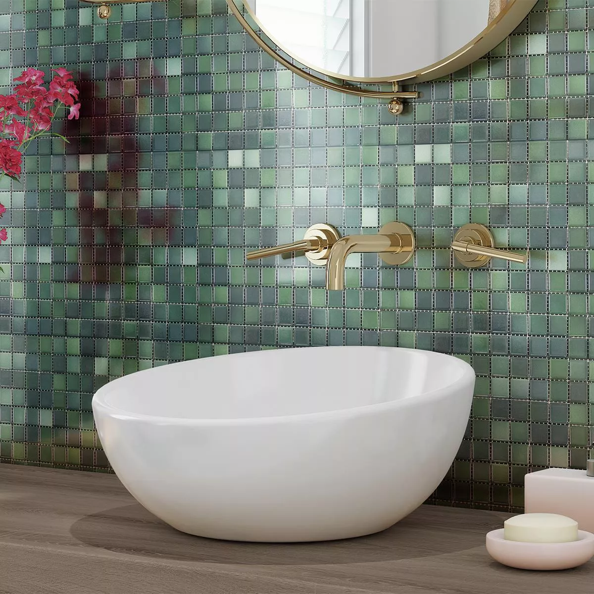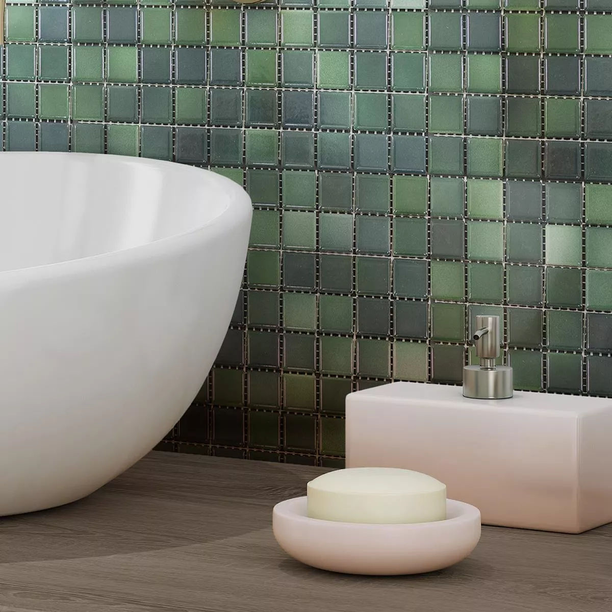 Med en fogbredd på 2 mm säkerställer den ett rent och jämnt monteringsmönster som optimalt visar upp kaklets grönblandade metallutseende. Gallerias mosaikplattor kombinerar modern estetik med praktiska fördelar och sätter snygga accenter i alla rum.