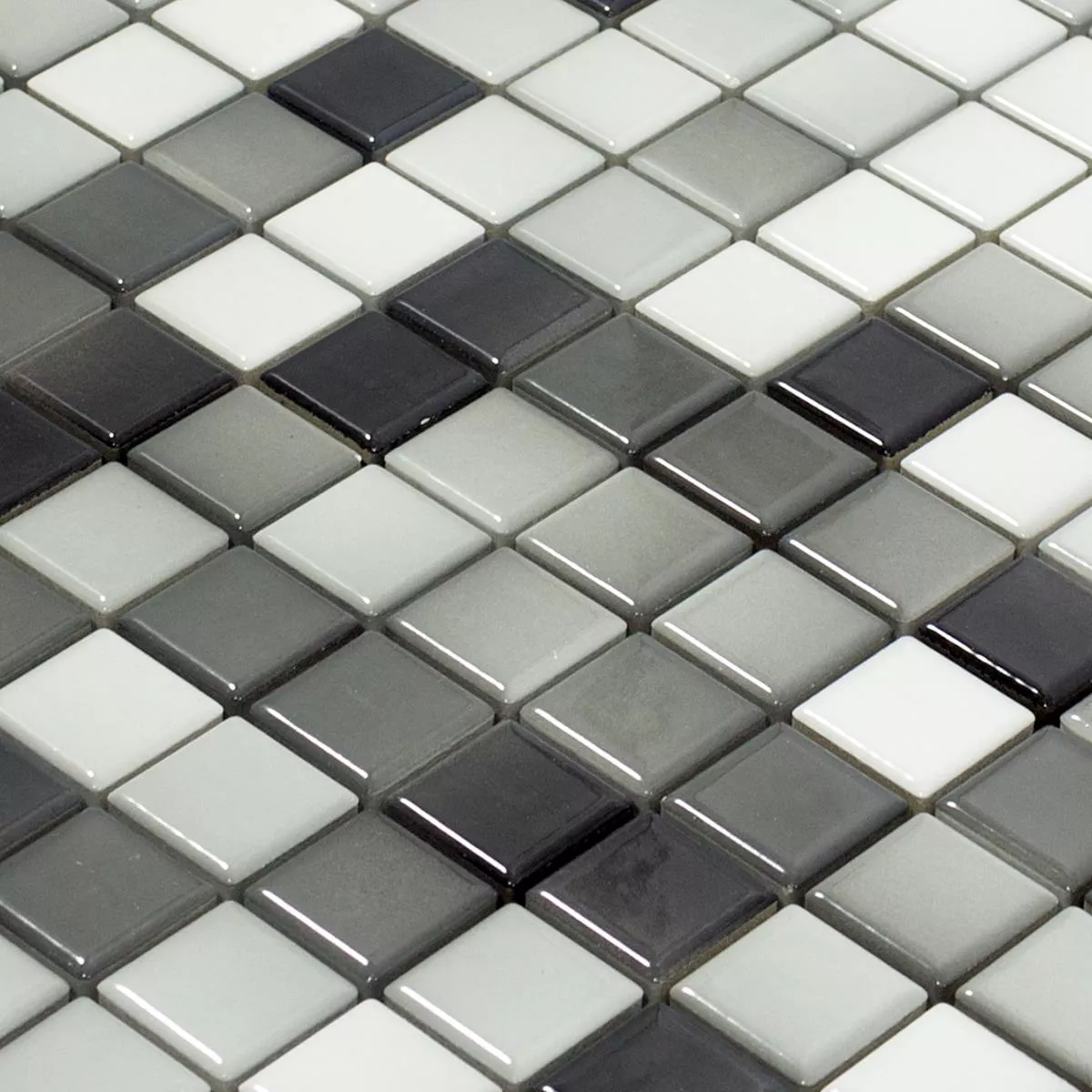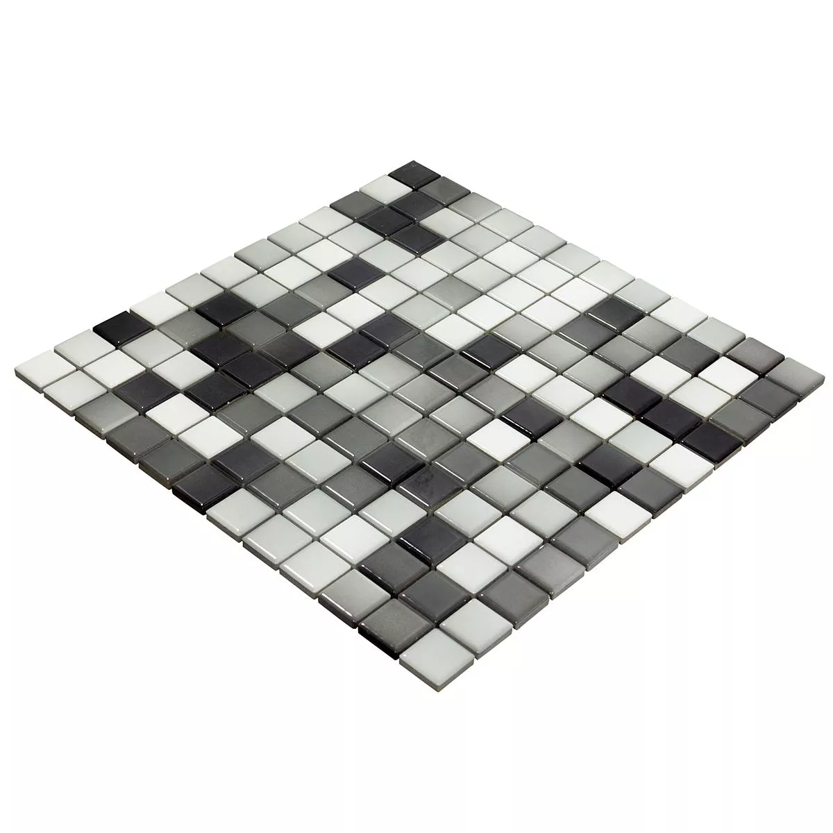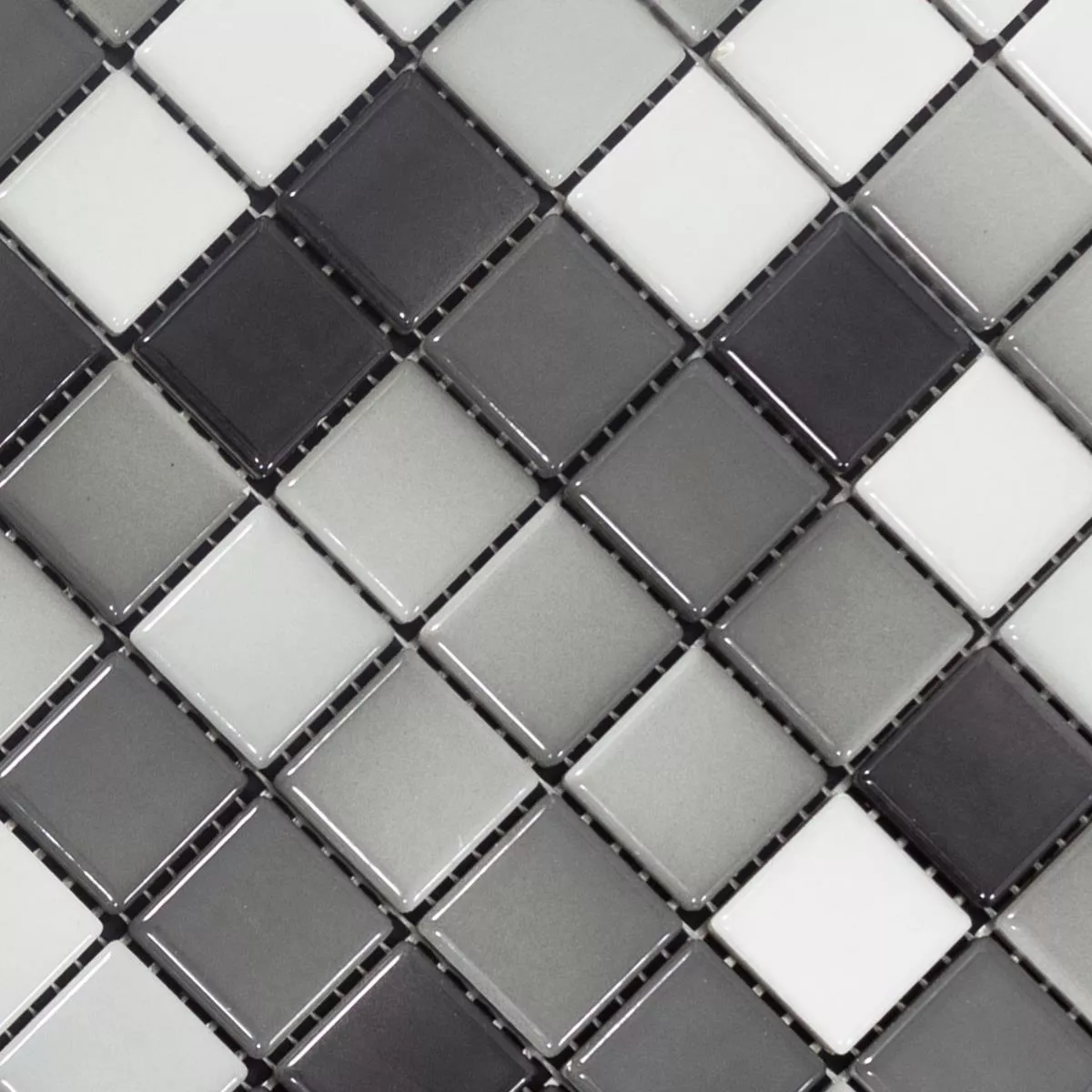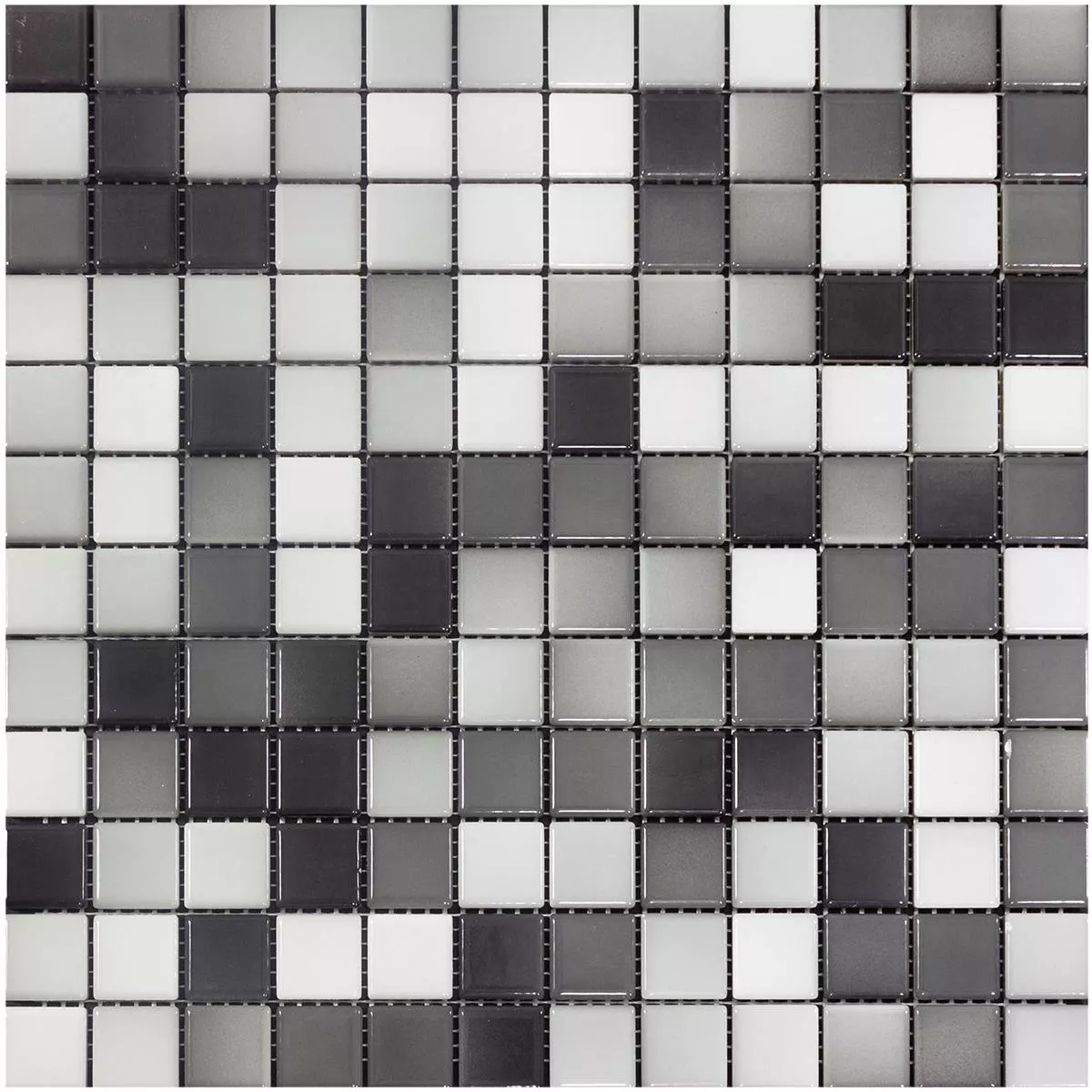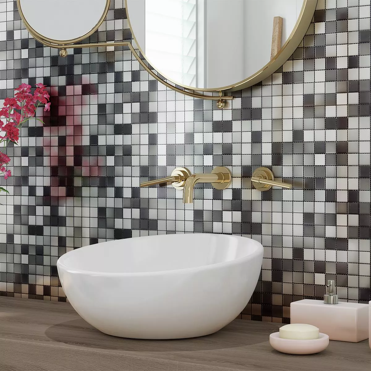 Gallerias keramiska mosaikplatta i den stilfulla färgkombinationen svart-grå-vit ger en modern touch till alla rum med sin moderna metalllook och matta yta. Med stenstorleken 23 x 23 mm och kakelmattan på 29,7 x 29,7 cm, som redan är limmad på ett nät färdigt för montering, är monteringen på både väggar och golv extra enkel och exakt.
