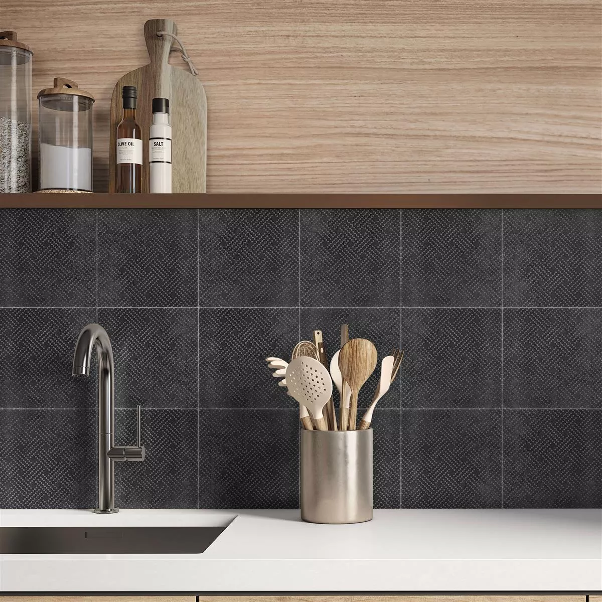 Ett paket med dessa plattor täcker 0,45 m² och det kvadratiska formatet gör dem flexibla för användning i badrum, våtutrymmen, kök, interiörer, vardagsrum och duschar. "Chicago metalllook antracit R9 - 18,5x18,5cm Pattern 1" erbjuder inte bara estetisk sofistikering, utan också praktisk användbarhet för en mängd olika inredningsdesigner.