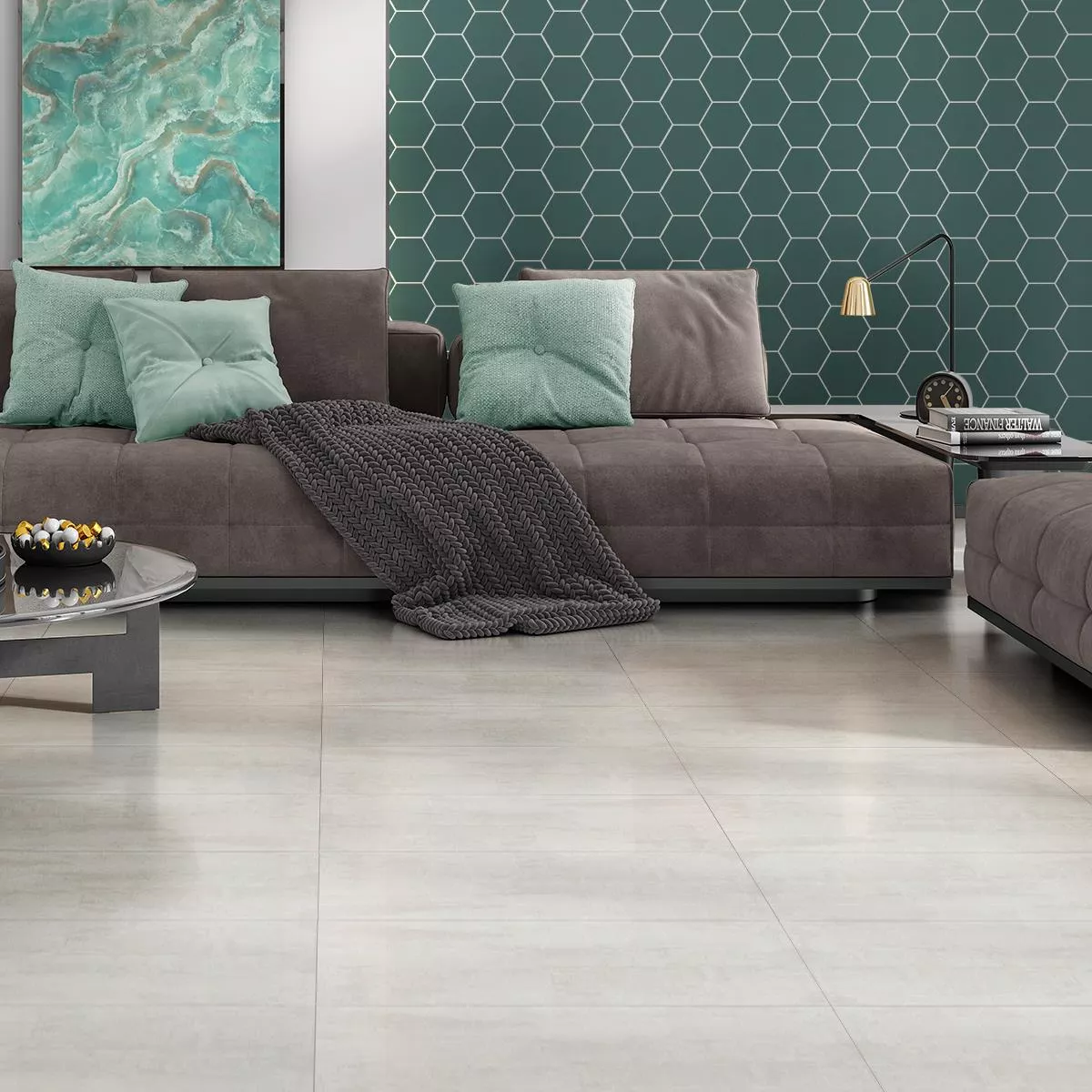 Den är särskilt lämplig att använda i badrum då den kan användas tillsammans med golvvärme. Men även andra interiöra rum i hemmet drar nytta av de vita Herion golvplattorna med metalllook.