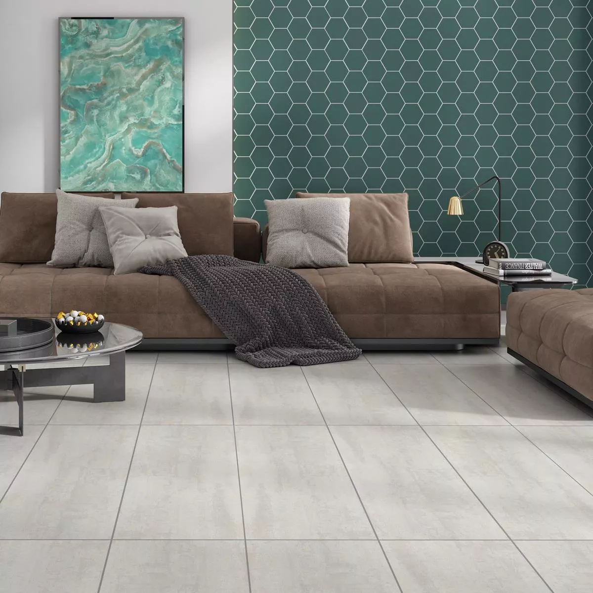 Den är särskilt lämplig att använda i badrum då den kan användas tillsammans med golvvärme. Men även andra interiöra rum i hemmet drar nytta av de vita Herion golvplattorna med metalllook.