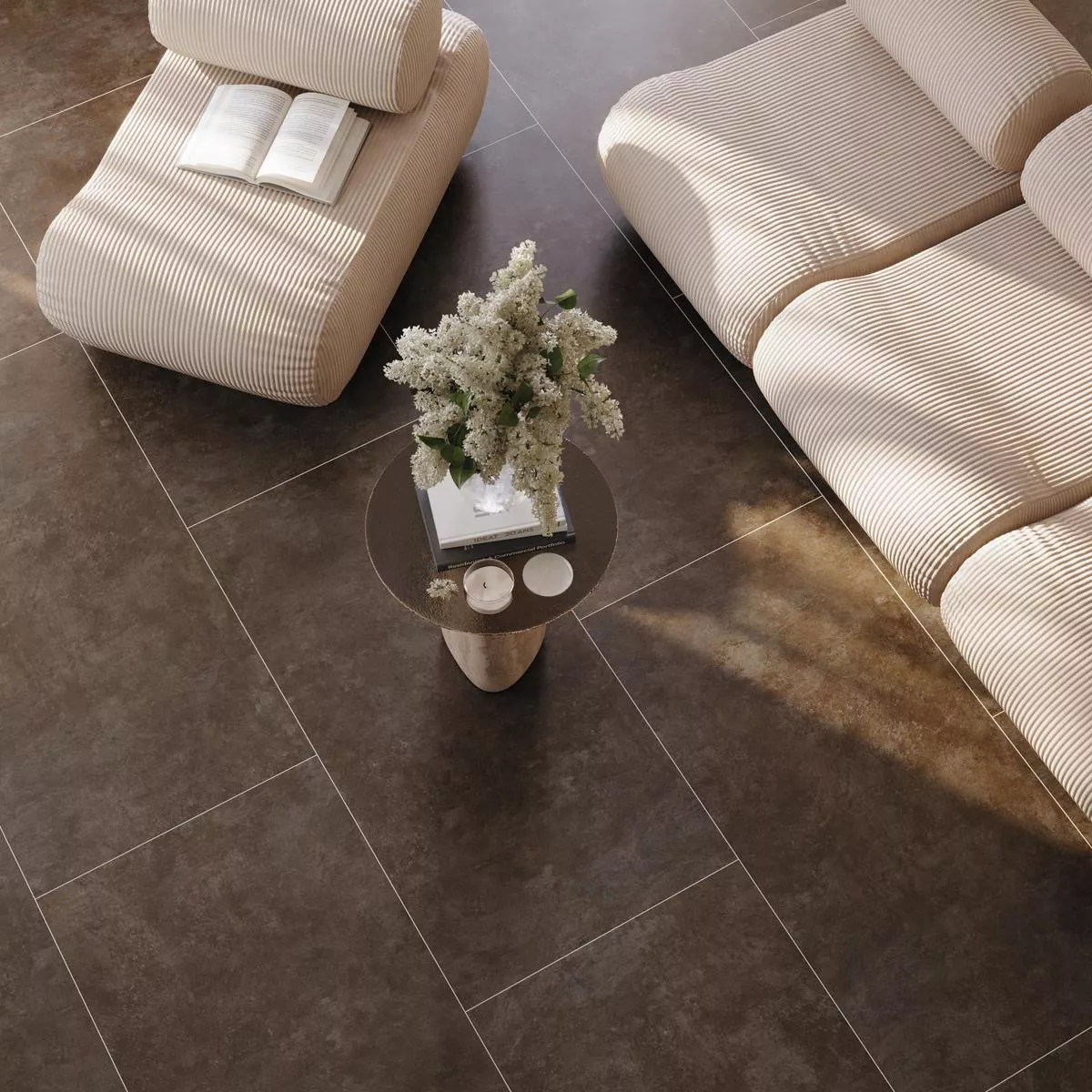 Tritons golvplattor av stengods i porslin i elegant brunt imponerar med sitt moderna betongutseende och ger vardagsrum och uteplatser en stilfull, modern atmosfär. Med sitt generösa format på 60 x 120 cm och den matta, glaserade ytan skapar den en harmonisk helhetsbild som fungerar bra i både minimalistiska och mysiga inredningskoncept.