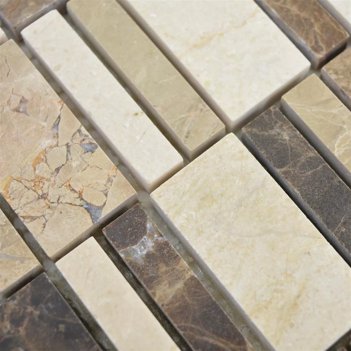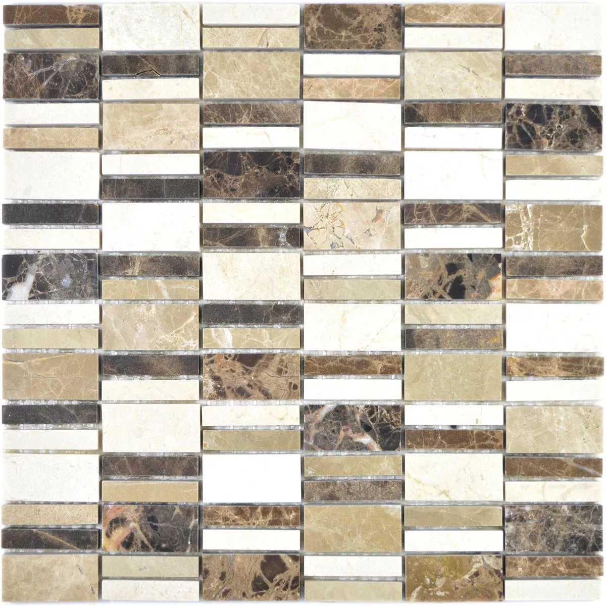 Marble Mosaic Tiles Sunbury är gjord av dyrbar marmor. Den är i färgerna brunbeige med en blank yta med stenstorlekarna 23 x 48 mm, 15 x 48 mm och 10 x 48 mm.