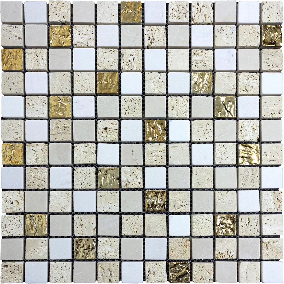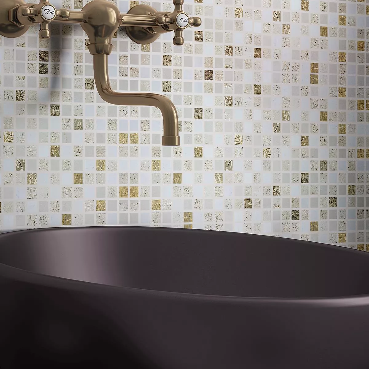 Upplev lyx med våra mosaikplattor i marmor natursten Limonello Gold Cream. Dessa fyrkantiga väggplattor med en stenstorlek på 20x20 mm ger din interiör en elegant färgpalett av guld, grädde och beige. Den matta ytan och strukturerade texturen skapar en lyxig atmosfär.