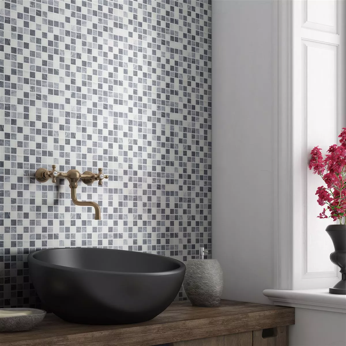 Stanfords marmormosaikplattor i grått och vitt kombinerar naturlig elegans med funktionella egenskaper. Dessa plattor är tillverkade av högkvalitativ marmor och erbjuder en matt finish som skapar en stilig, sofistikerad look samtidigt som de är praktiska och lätta att underhålla.