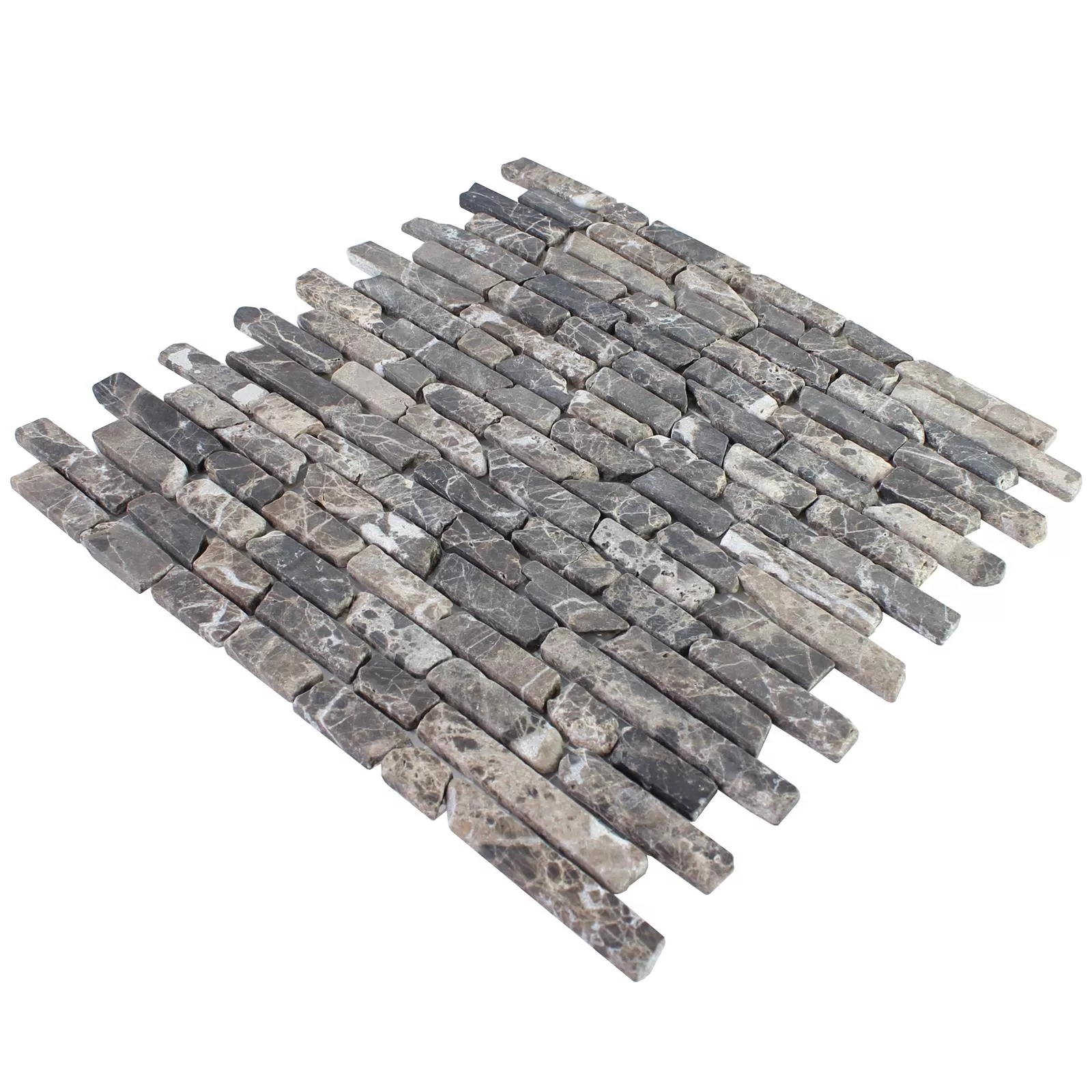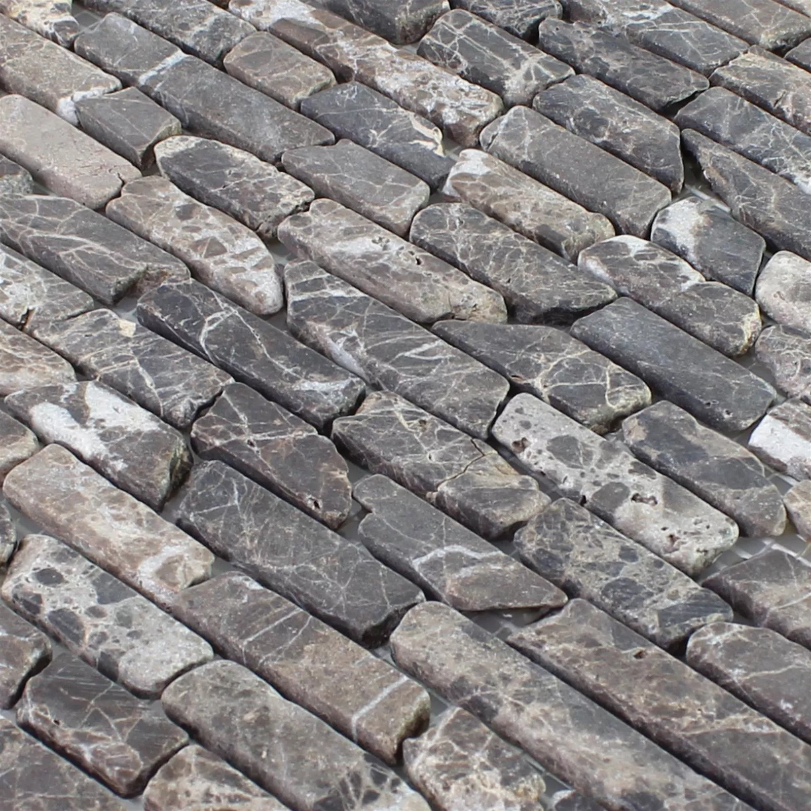 Ändarna på dessa naturstenselement är finpolerade, de behåller sin slumpmässiga, varierande naturliga form och erbjuder medel ljusgenomsläpplighet, vilket gör att de glittrar behagligt. De övre och nedre kanterna på dessa element skärs parallellt. Tillsammans på en matta bildar de ett mönster uppdelat i segment med en matt yta, vilket resulterar i en mosaik av rader av rektanglar. Denna mosaikplatta följer dig frostsäker genom den kalla årstiden.