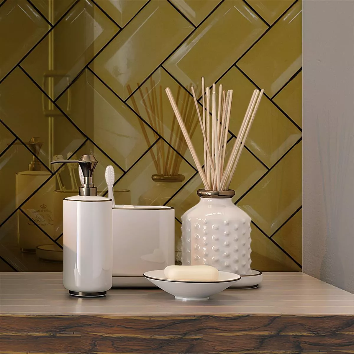 Metro väggplattor "Heliopolis Facette Gold" ger din interiör en touch av lyx. Det rektangulära formatet (7,5x15cm) i glänsande guld ger en mångfacetterad elegans till kök, badrum, dusch och vardagsrum. Med en tjocklek på 10 mm och en icke korrigerad yta förmedlar dessa glaserade stengodsplattor en autentisk metrokänsla.