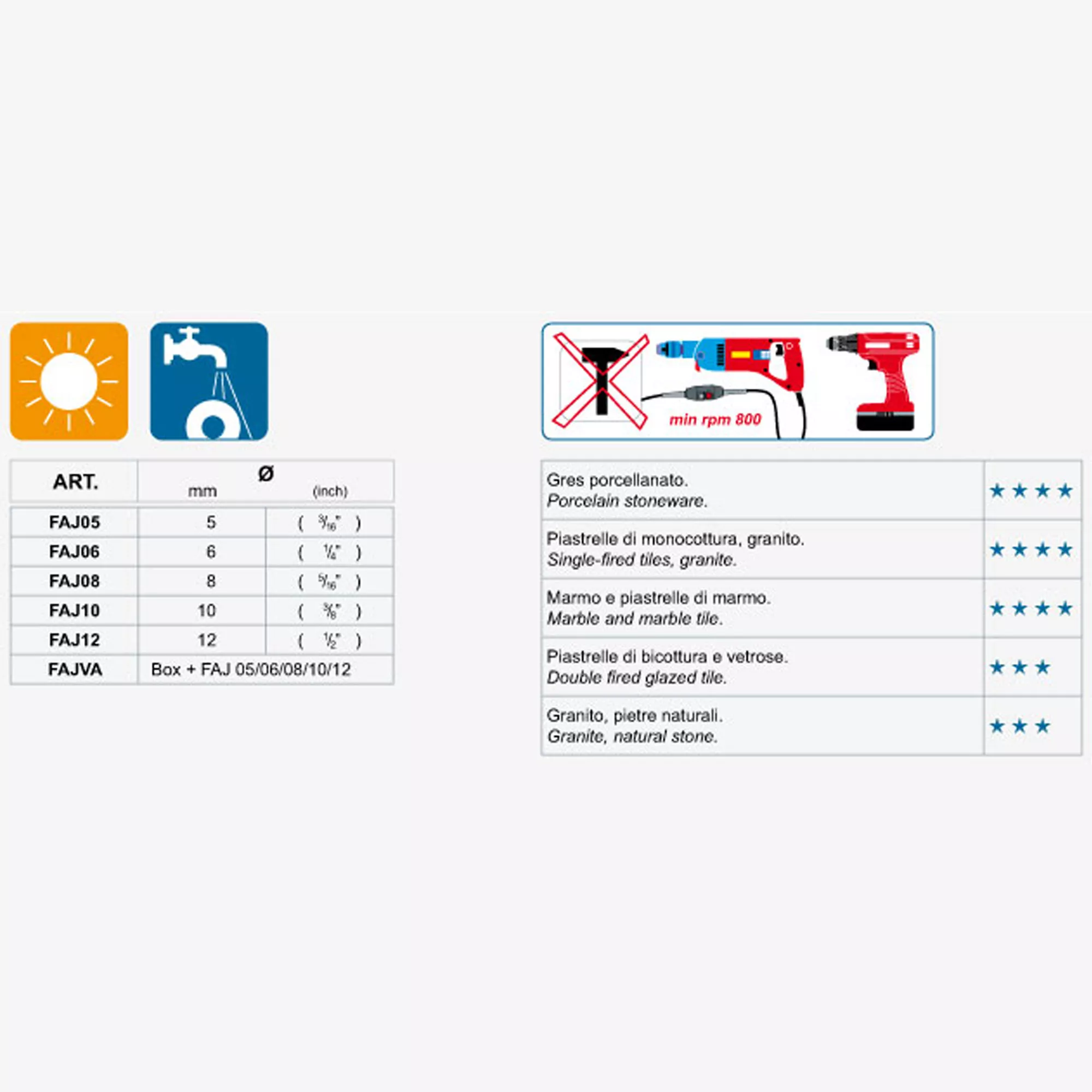 Om du vill använda diamantkärnan behöver du en borr med minst 800 rpm eller mer. Mondrillo diamantborrkrona finns i 5 olika storlekar. Kunden kan välja mellan diametrarna 5, 6, 8, 10 och 12 mm. Diamantverktyg som detta anses vara särskilt hårda och är designade för en mängd olika jobb. Även om detta diamantverktyg är lämpligt för torrborrning, finns det andra verktyg som kan användas för våtborrning. När du köper en borr och ett diamantverktyg bör du vara uppmärksam på hög kvalitet och felfritt utförande. Verktyget som presenteras här bör användas med en lämplig eller kompatibel borr.