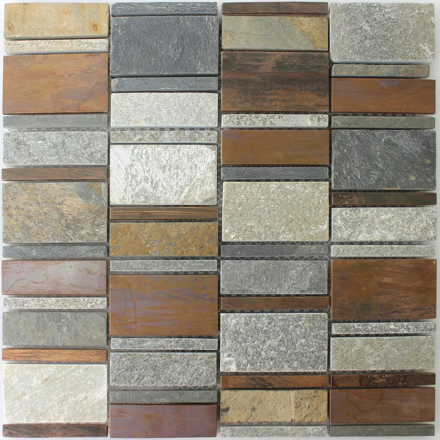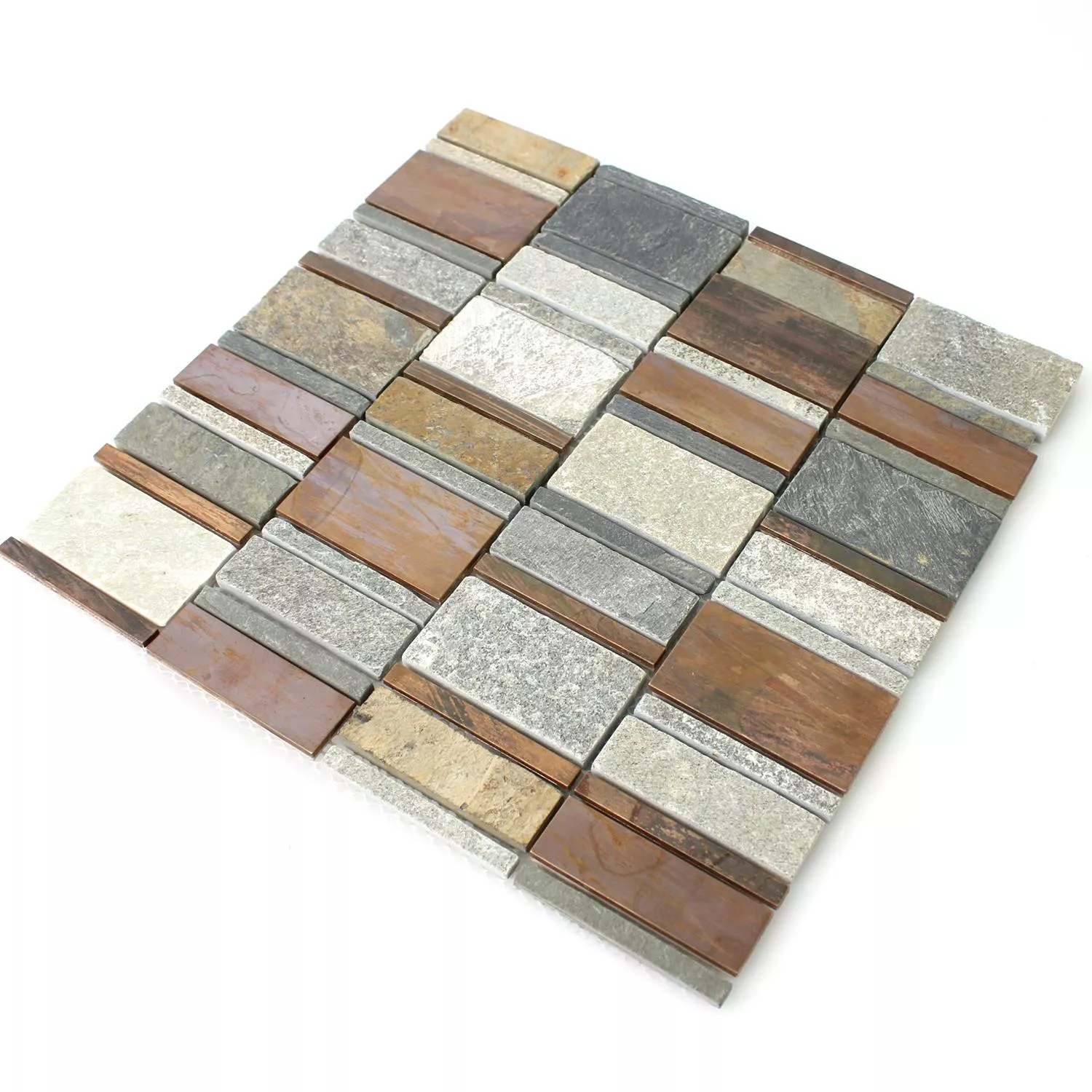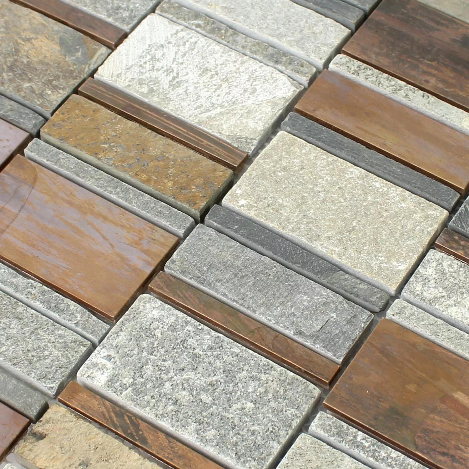 Die Mosaikfliese Various verbindet natürliche Eleganz mit modernem Design und schafft eine warme, stilvolle Atmosphäre in jedem Raum. Die harmonische Farbkombination aus Braun, Grau, Kupfer und Rost verleiht den Fliesen eine edle Optik, die besonders gut mit zeitlosen sowie industriellen Einrichtungsstilen harmoniert. Durch die Mischung aus Naturstein, Metall, Aluminium und Quarzit entsteht eine abwechslungsreiche Oberfläche, die durch ihre matte und gebürstete Beschaffenheit eine angenehme Haptik erhält.