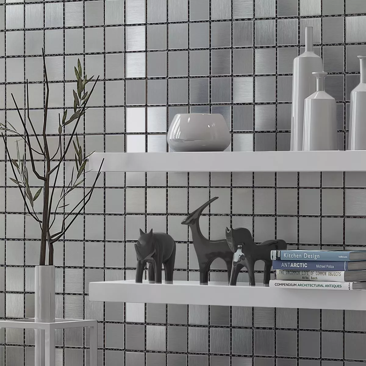 Ge dina rum en modern, industriell stil med mosaikplattorna Silvernova Square 48 i borstat rostfritt stål. Dessa högkvalitativa rostfria plattor kombinerar modern design med långvarig funktionalitet och är idealiska för eleganta accentområden.