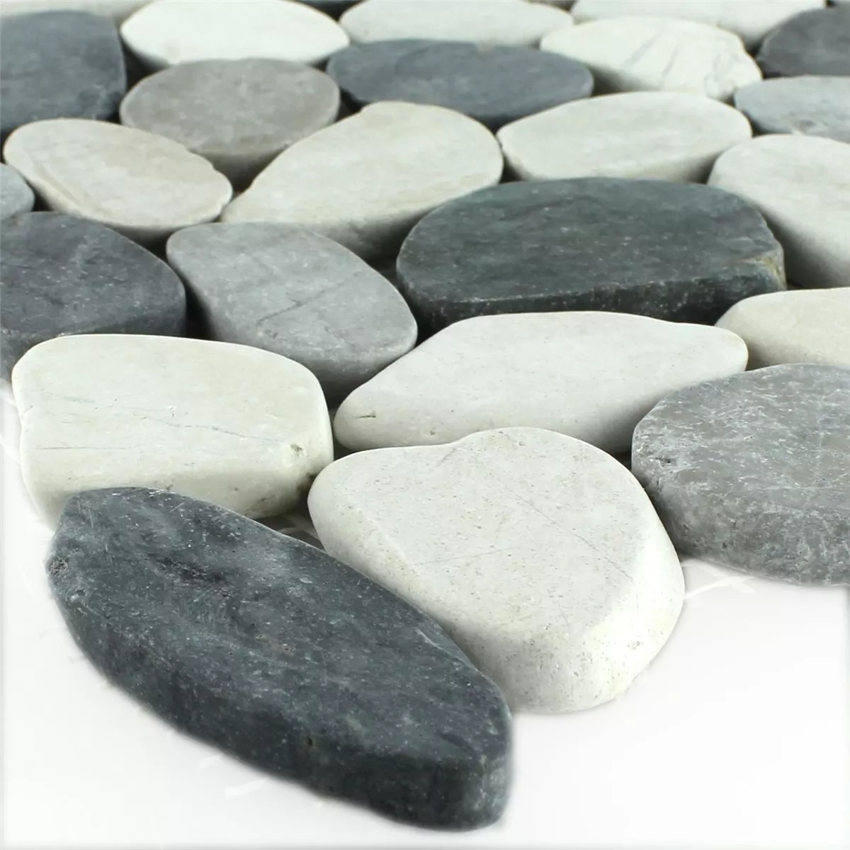 Sehr schöne Kieselmosaikfliesen, Farbton wie auf den Bildern dargestellt. Das Verlegen der Fliesen natürlich ein Geduldsspiel, sieht aber sehr schön aus. Da sie geschnitten (oder geschliffen?) sind, für den Boden bestens geeignet.