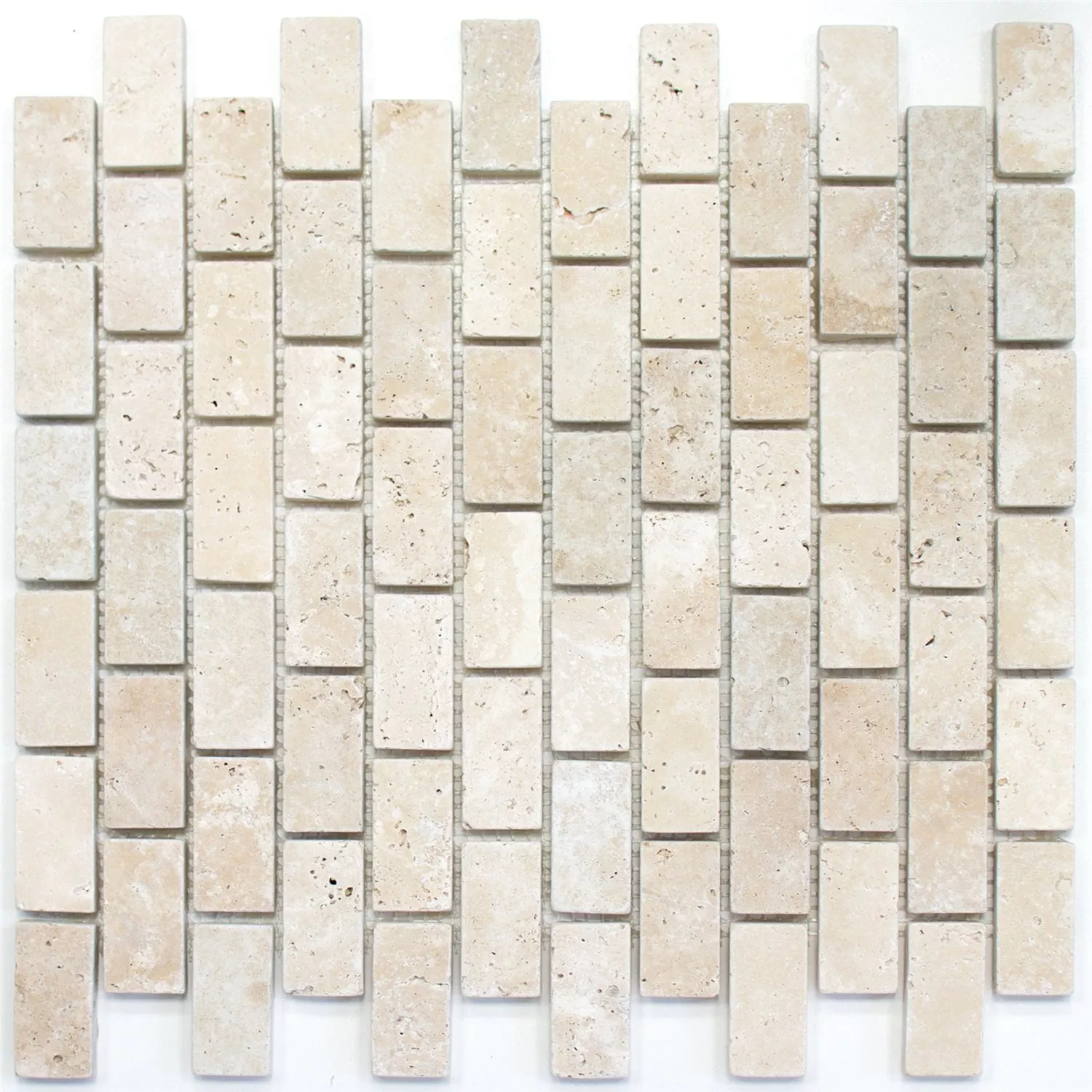 Travertinmosaikplattorna Barga beige Brick kan också läggas som ett "romerskt band". Kakelpaket monterade för detta ändamål gör denna uppgift ännu enklare. Genom en kombination av de olika kakelformaten och mosaikplattorna kan ytor utformas som inte längre går att överträffa vad gäller unikhet. Det finns inga gränser för din fantasi med dessa plattor.