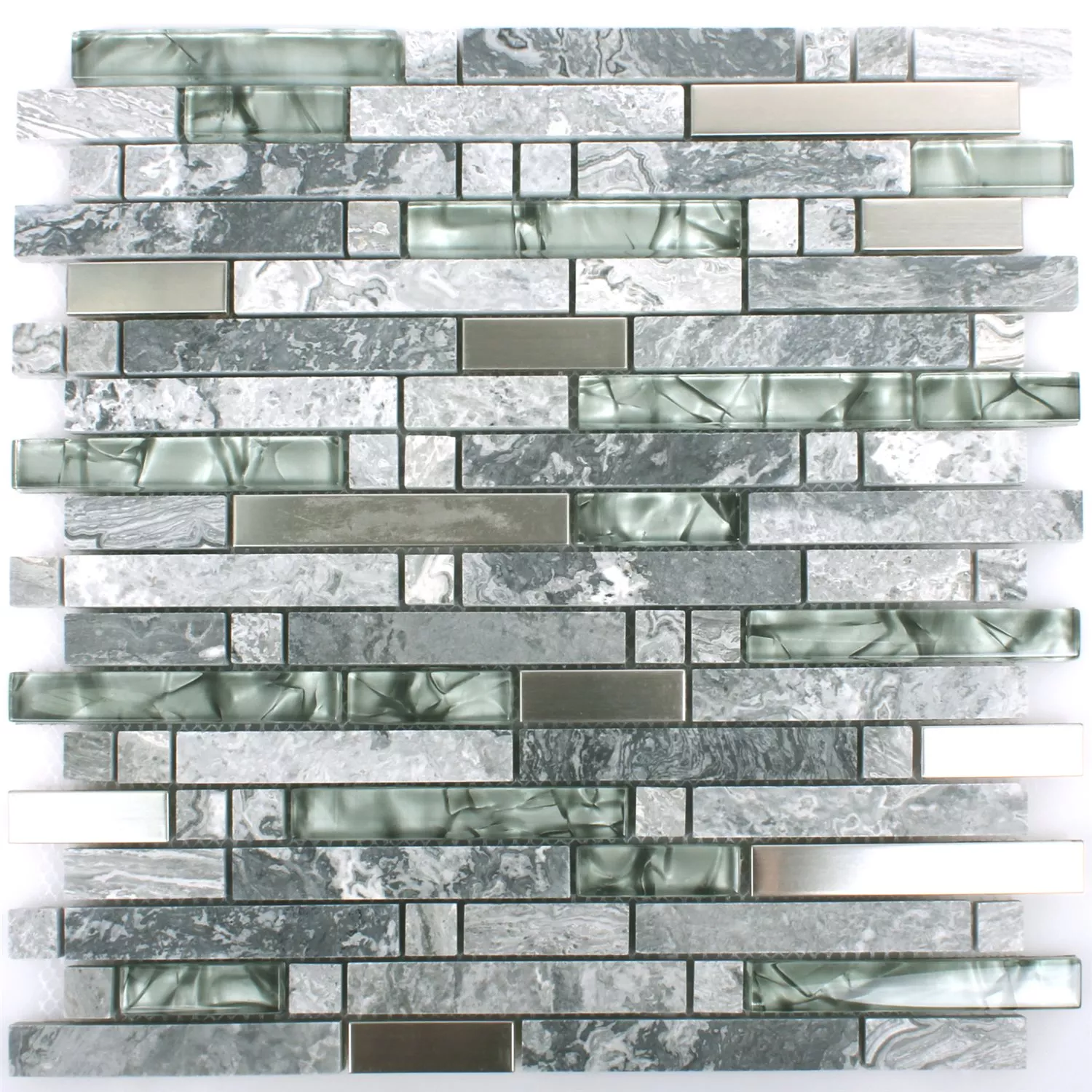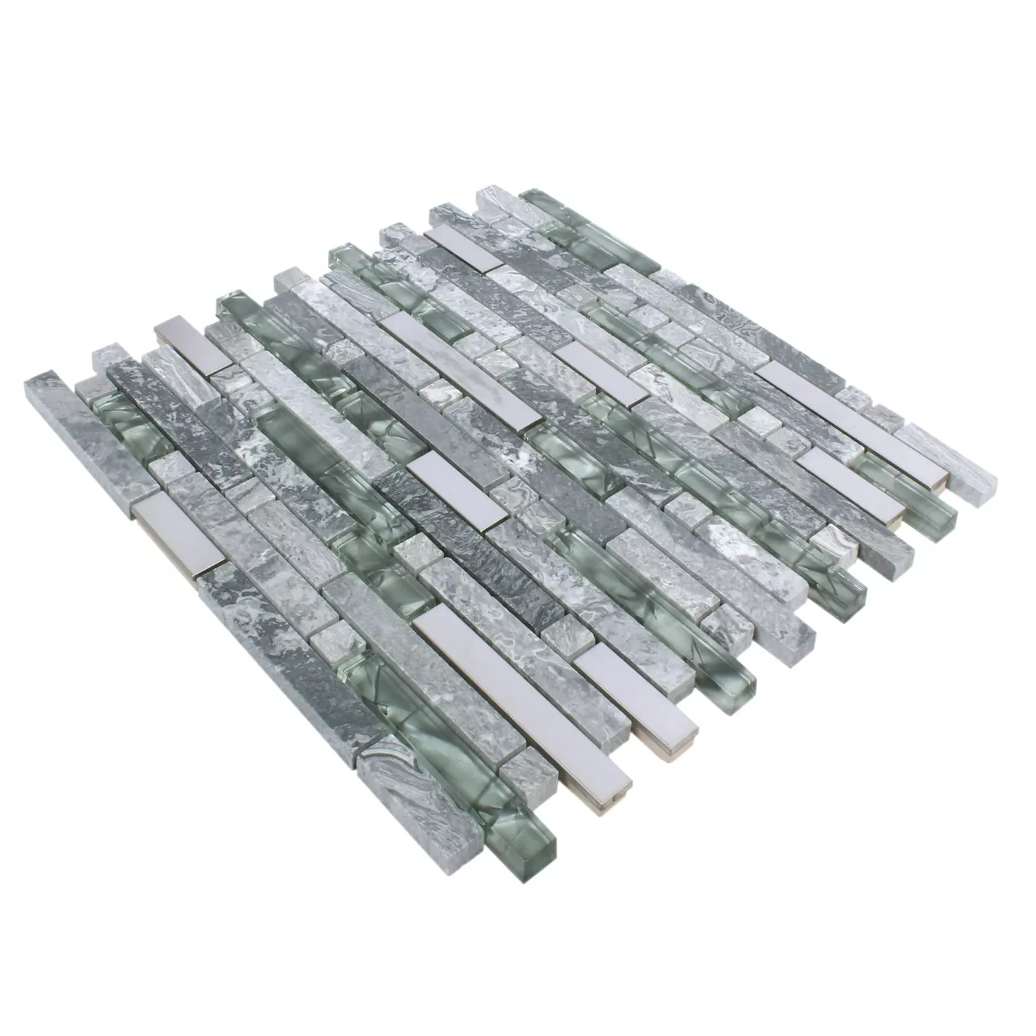 Blandningen av dessa ovanliga mosaikplattor är borstad, glänsande och polerad. Materialblandningen är asiatisk stil och grått. Sammantaget bearbetas naturstenar, glas och rostfritt stål. Alla delar är rektangulära, stenarna är naturliga. Glaset skimrar i glänsande grått bredvid det lätt borstade rostfria stålet. Alla plattor läggs på en matta och kan därför bearbetas mycket enkelt. En kombination med flera mattor är möjlig utan problem. Mosaikplattorna är särskilt lämpliga som väggbeklädnader.