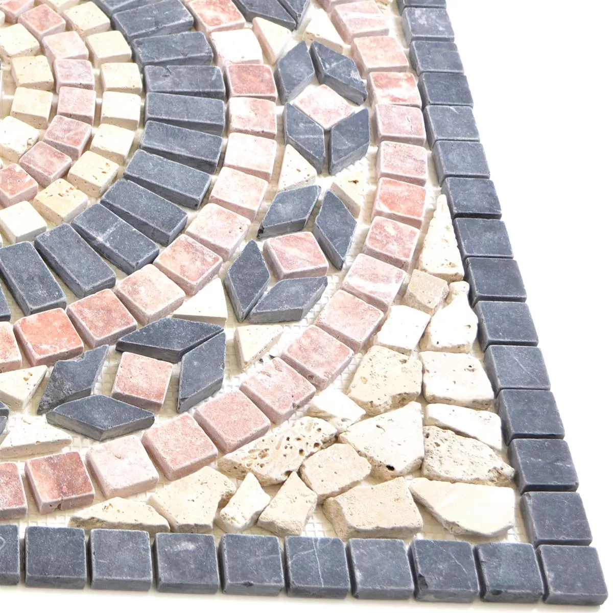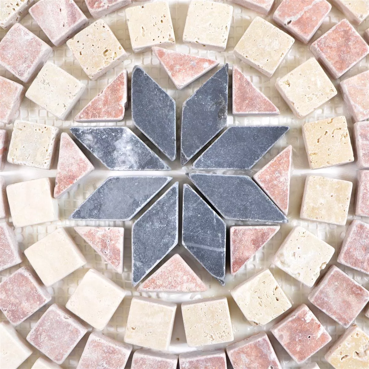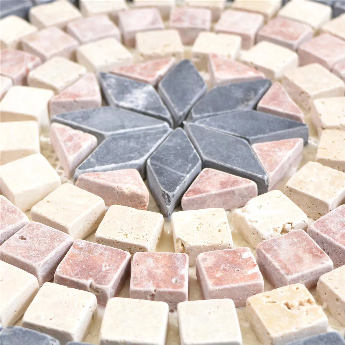 Den smakfullt tillverkade mosaikplattan Rosone Buxton är gjord av naturlig travertinsten och imponerar med en elegant färgkombination av beige, svart och rosa, samt ett intressant, cirkulärt mönster. Den matta ytfinishen ger kaklet ett antikt utseende, vilket ger boendemiljön en extraordinär touch. Kakelplattan är både halkfri och frostbeständig, så den kan även användas på altanen.