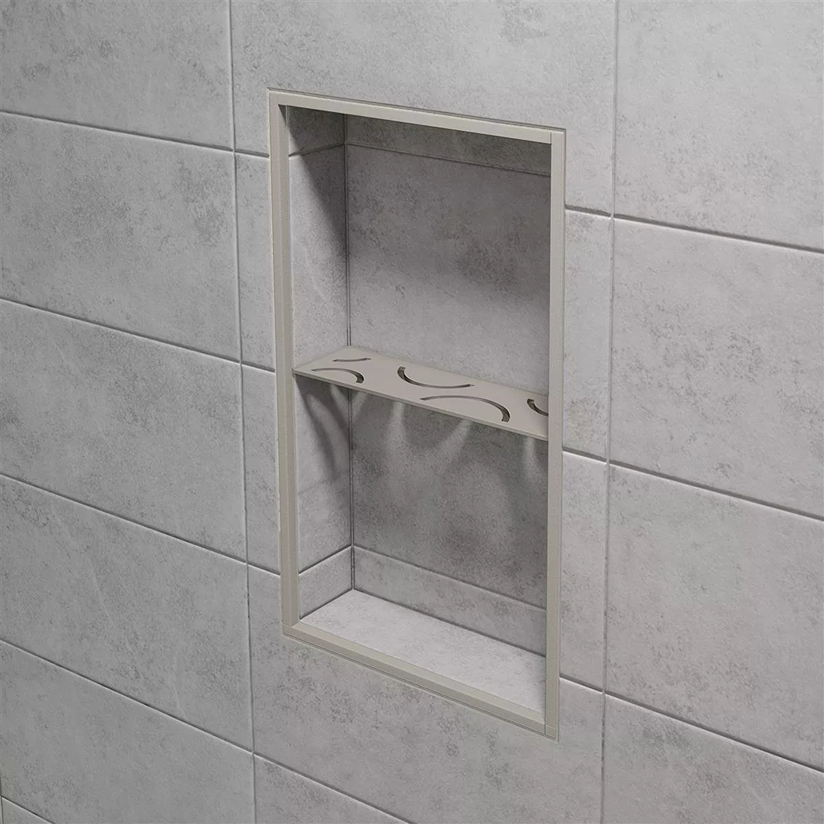 Schlüter-SHELF-N-S1 Grå Rektangulär nischvägghylla Med Schlüter-SHELF-N-S1 kan du förse den prefabricerade Schlüter-KERDI-BOARD-nischen med en exakt passande hylla vid kakelläggning. Det är inte allt: du har också maximal flexibilitet när det gäller material och design. Den högkvalitativa nischvägghyllan är gjord av antingen borstat rostfritt stål eller texturerad aluminium.
