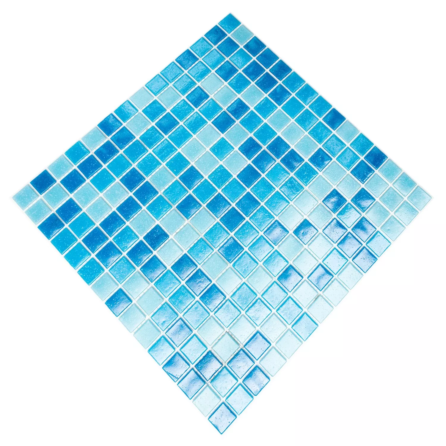 Blå mosaikplattor för inomhus- eller utomhuspool. Papperslimning gör skärningen lättare för hantverkaren. Tack vare glasytan kan de snabbt rengöras.-