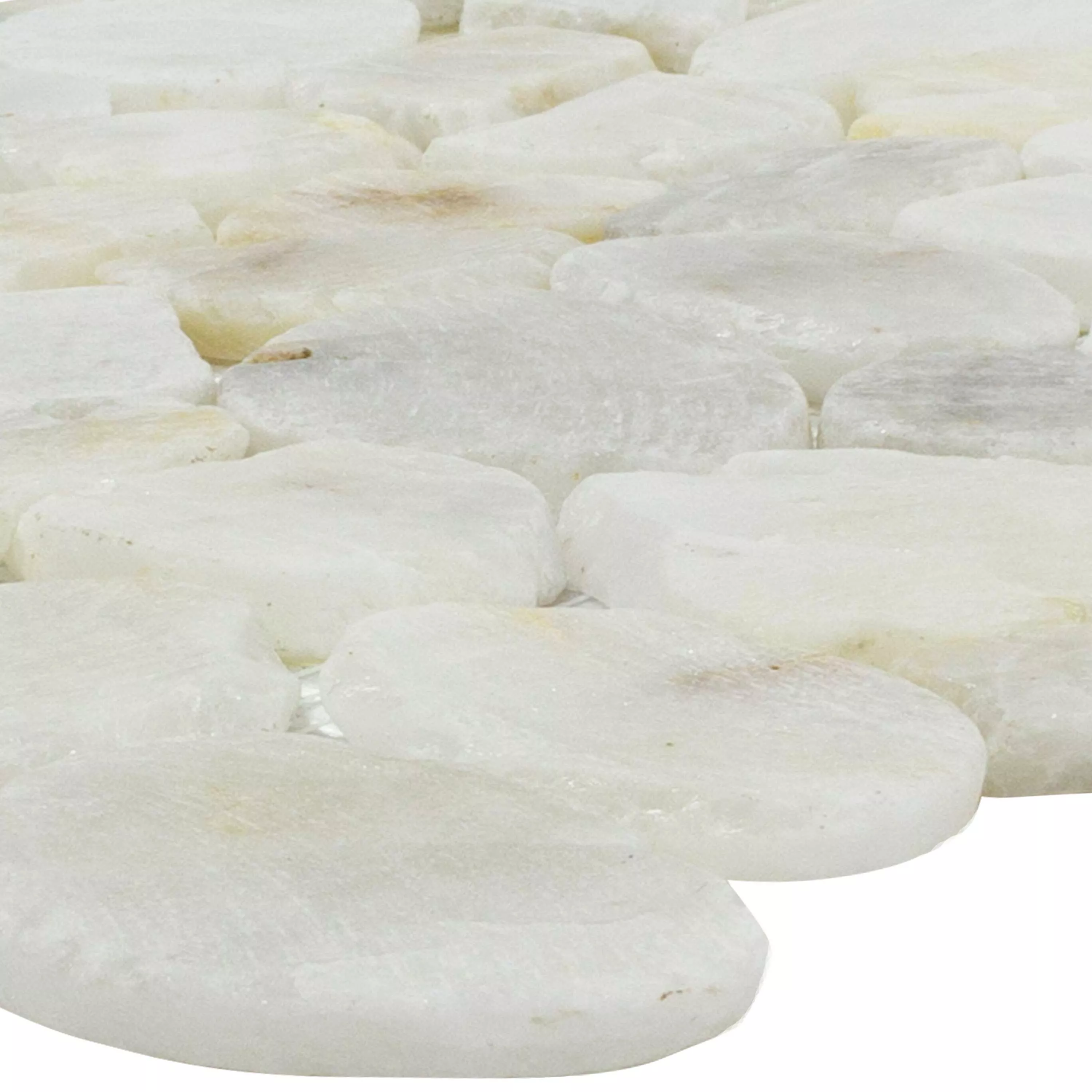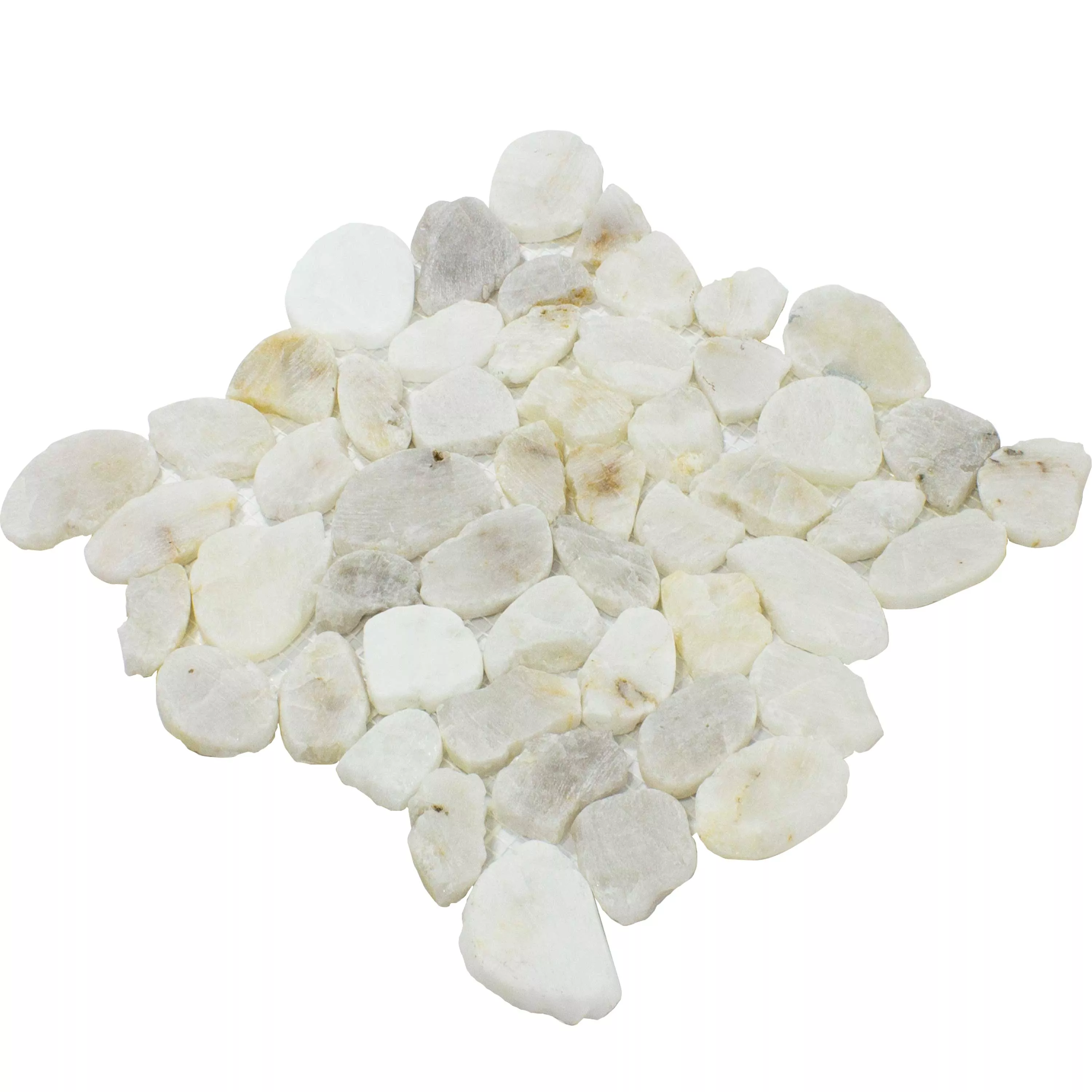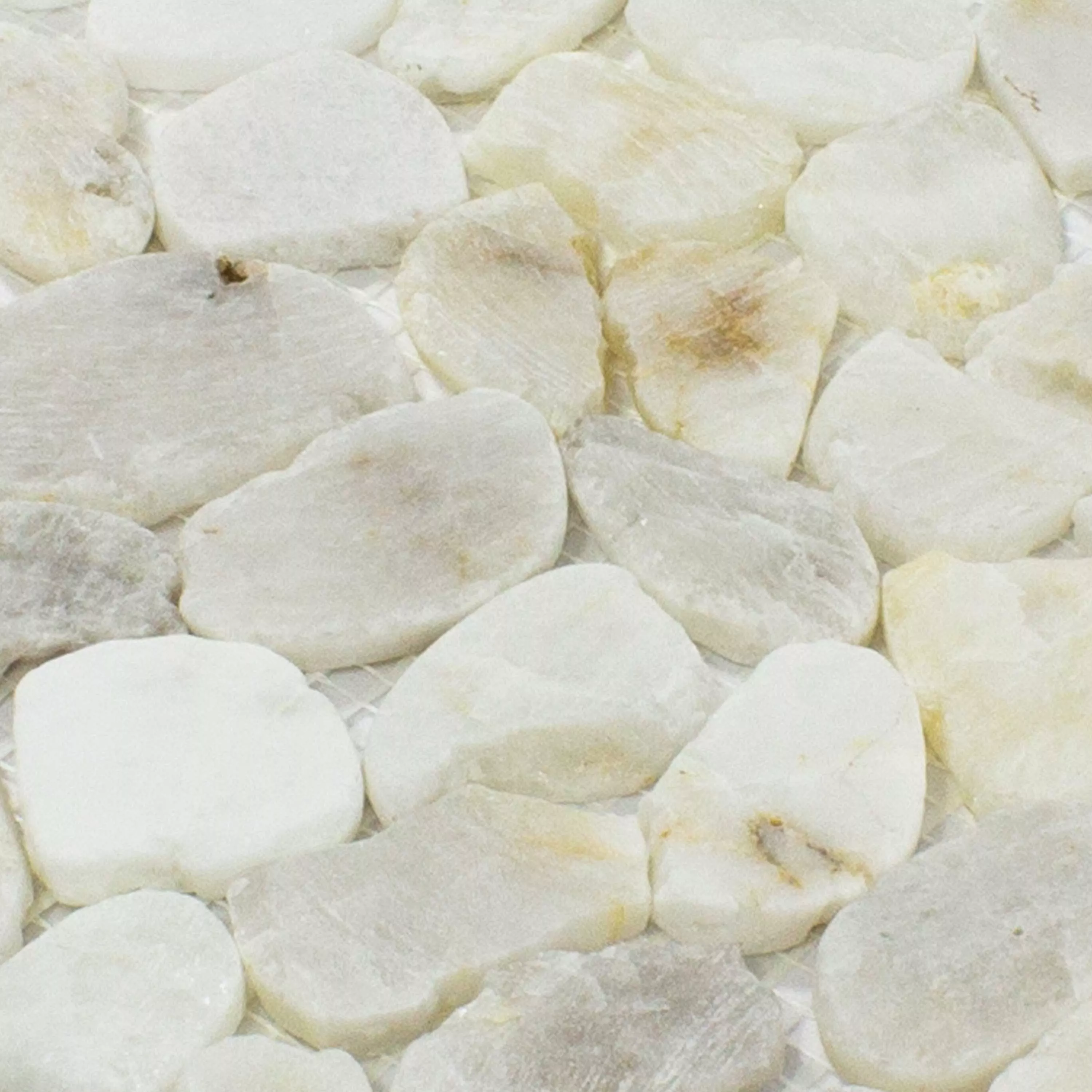 Naturlig elegans presenteras i floden pebble mosaik natursten kakel Riva White. Den tidlösa vita nyansen, matta ytan och den unika kvartslooken ger dina rum en harmonisk look. Dessa plattor är gjorda av natursten och är lämpliga för vägg- och golvbeläggning, med extra frostskydd och halkskydd.