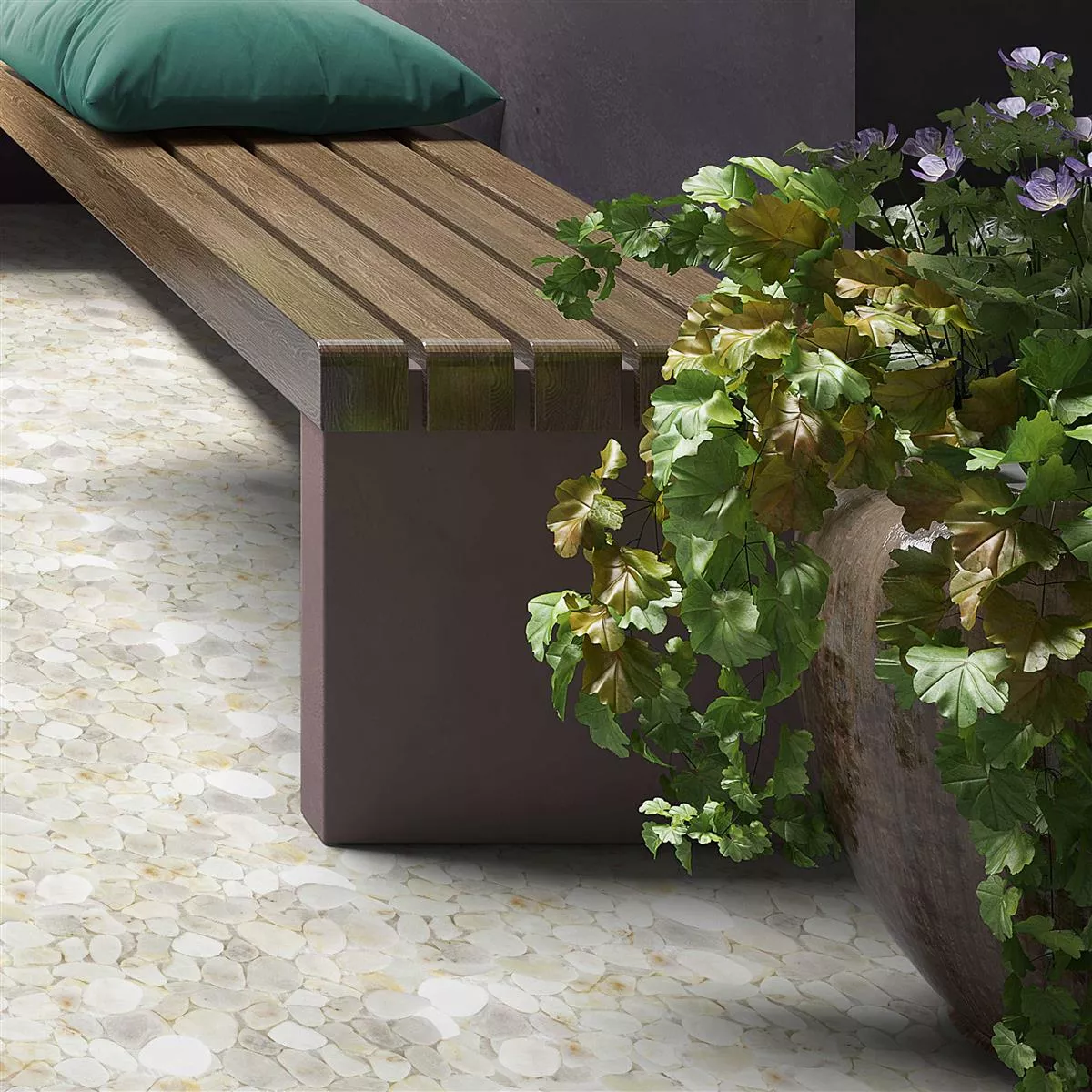 Dessa naturstensplattor är lämpliga för inomhus och våta utrymmen samt utomhus tack vare sin frostbeständighet. Ge dina rum en naturlig och harmonisk touch med flodstenmosaiken Riva White och designa dem efter dina individuella idéer.