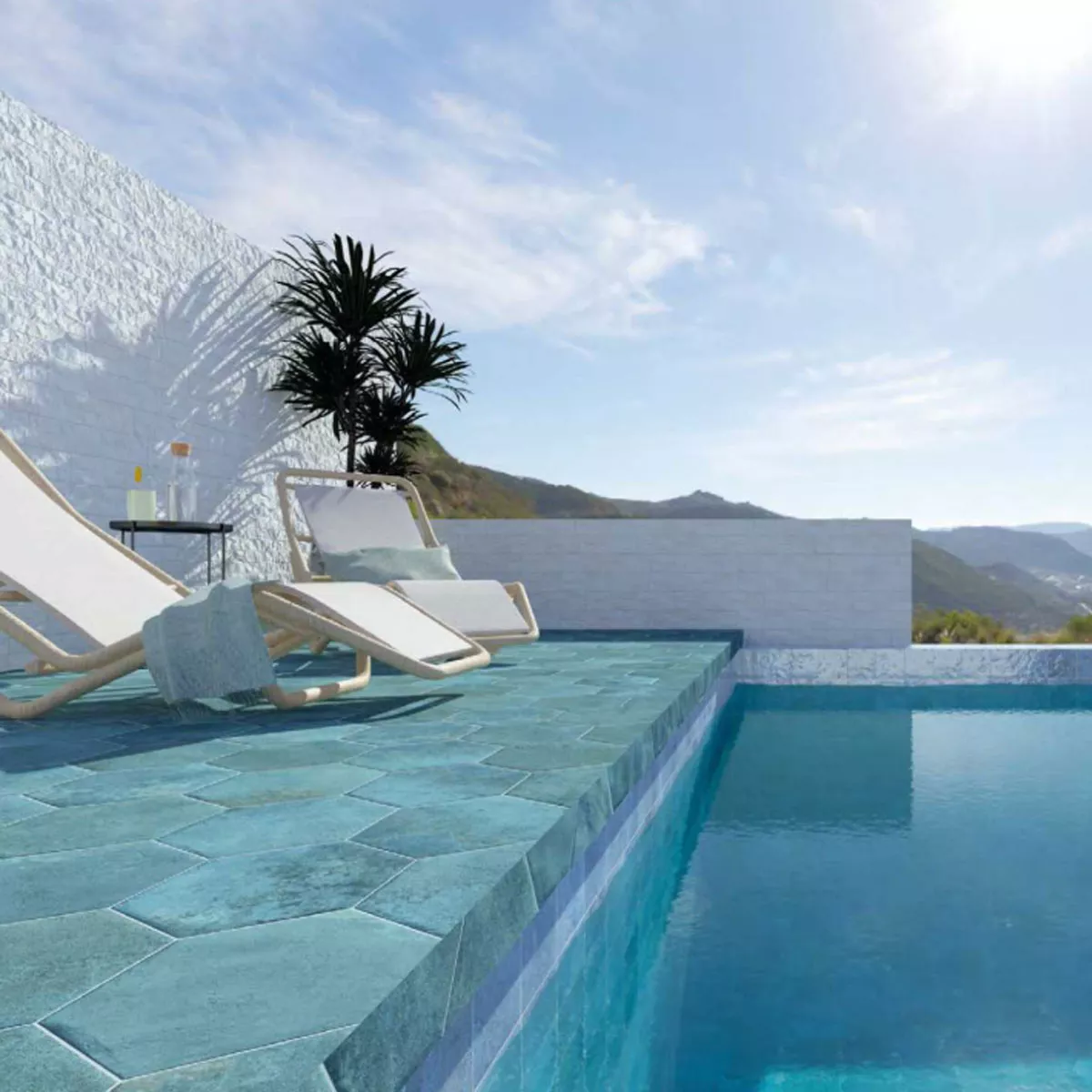 Upptäck våra mångsidiga Palencia Turquoise Hexagon-plattor av högkvalitativt porslinsstengods - det perfekta valet för din pool, pool och många andra områden!