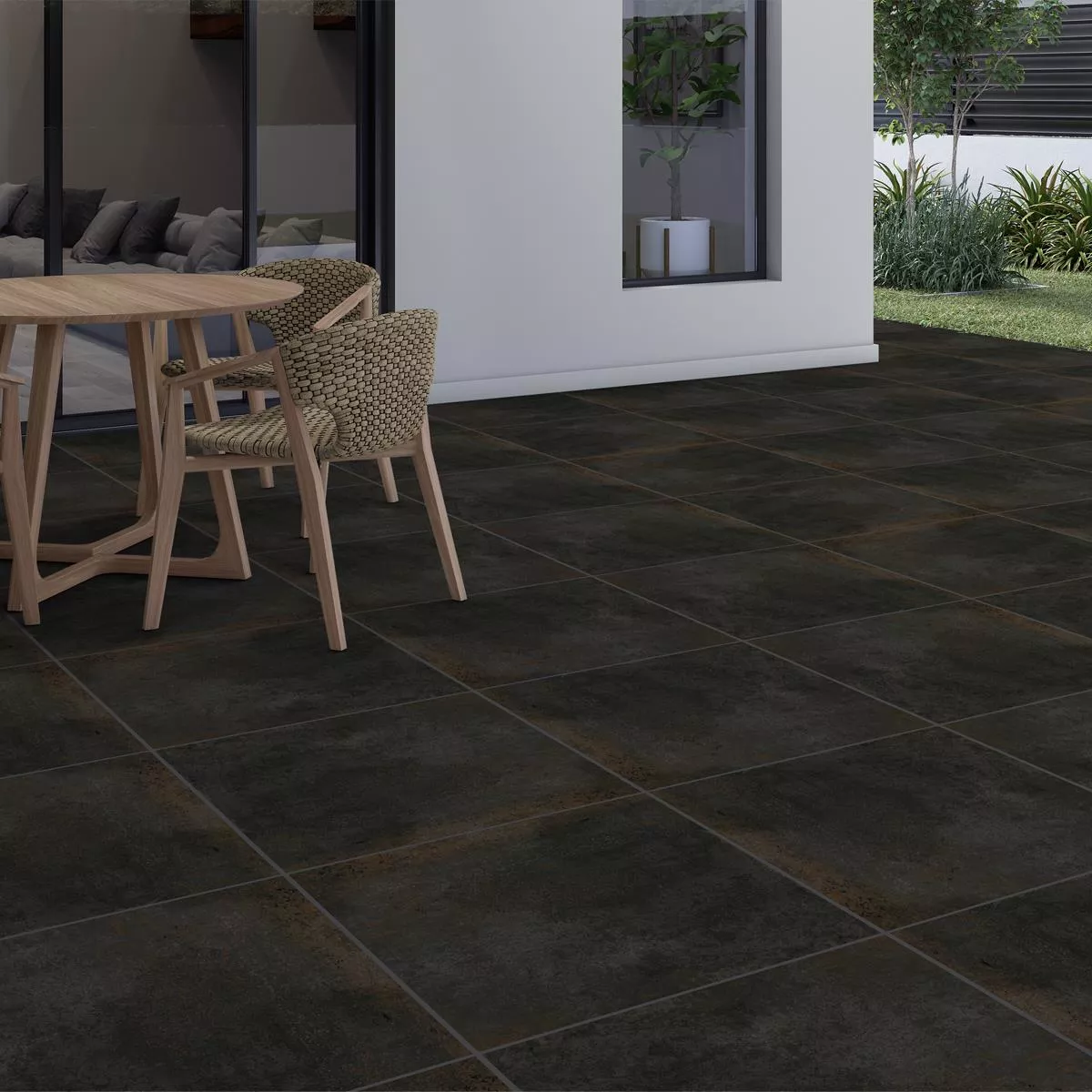 Panelerna i elegant antracit finns i formatet 60 x 60 cm och en tjocklek på 20 mm och erbjuder en elegant metalllook som ger din uteplats en modern och stilren look. Dess matta yta skapar en chic men ändå tålig yta som understryker den industriella karaktären.
