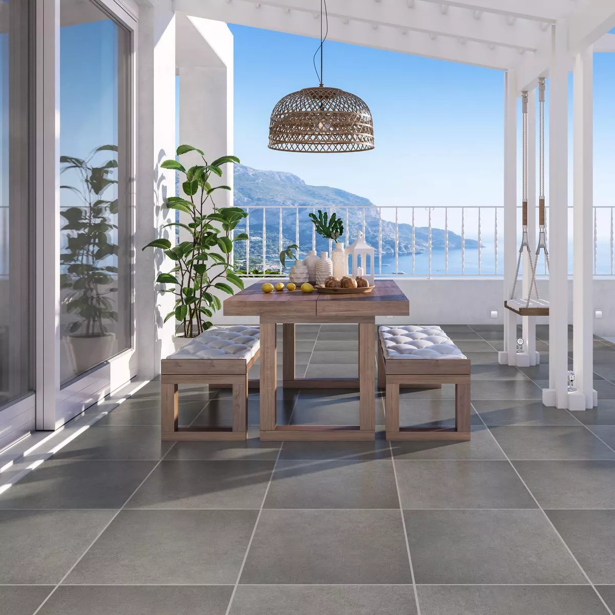 Uteplatsplattorna av porslin i stengods i betonglook Panama Mörkgrå 60x60x2 cm är det perfekta valet för snygga och robusta golvbeläggningar i dina utomhus- och inomhusutrymmen. Dessa fyrkantiga paneler i färgen mörkgrå imponerar med sin moderna betonglook och en matt yta som skapar en modern estetik.