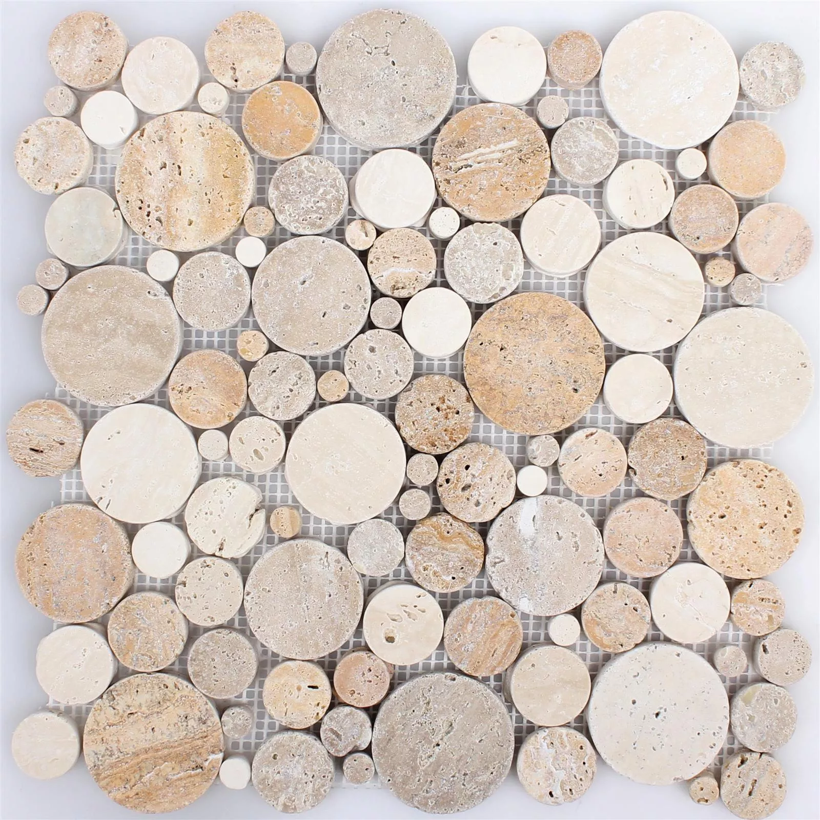 Den matta och tumlade ytan ser väldigt tilltalande och extremt modern ut. De cirkulära stenarna med olika diametrar ser mycket hög kvalitet ut och är en höjdpunkt i varje badrum. Travertin-naturstensmosaiken Franklin kan användas som väggkakel, golvkakel eller mosaikplatta. Dessutom erbjuds travertin-naturstensmosaiken Franklin i tre olika ljusa färger så att du kan ta med din egen smak: guld, beige och vit.