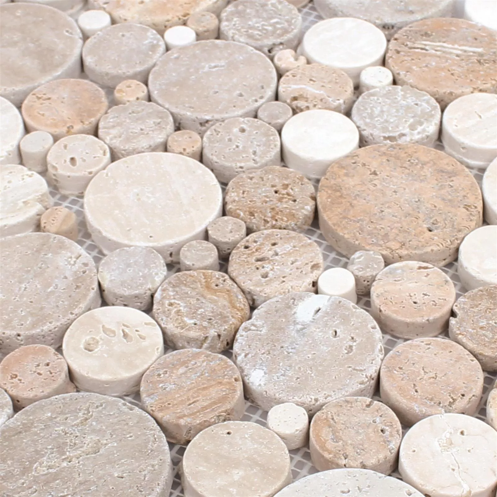 Det runda formatet och naturstenarnas varierande storlek sätter naturliga accenter i ditt rum och ger rummet en varm och mysig atmosfär. Travertin naturstensmosaiken Franklin kan därför underbart kombineras med andra naturmaterial.