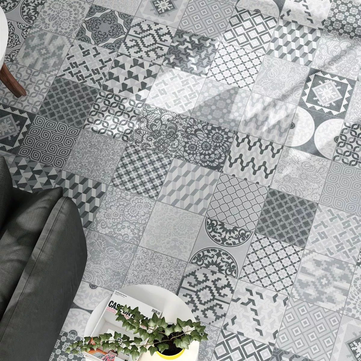 Da die aktuellen Bodenfliesen mit symmetrisch gestalteten Motiven verziert sind, bieten sie immer wieder einen spannenden Anblick, der das Auge des Betrachters nie ermüdet. Die Kreise und Quadrate bieten auch im Zusammenspiel mit modernen Lichtquellen an der Decke oder auf dem Boden neue architektonische Erlebnisse in großen und kleinen Räumen. Insbesondere graue Wandfliesen passen Ton in Ton zu den feinen Zementfliesen Optik Madrid. Doch die hochwertigen Bodenfliesen in den hellen und dunklen Graunuancen lassen sich auch zu vielen anderen Wandfliesen in trendigen Farben wie Rot oder Grün kombinieren. Die pflegeleichten Bodenfliesen im beliebten Vintage-Stil sind im Handumdrehen mit einer leichten Seifenlauge gereinigt und erstrahlen in gewohntem leicht mattem Glanz.